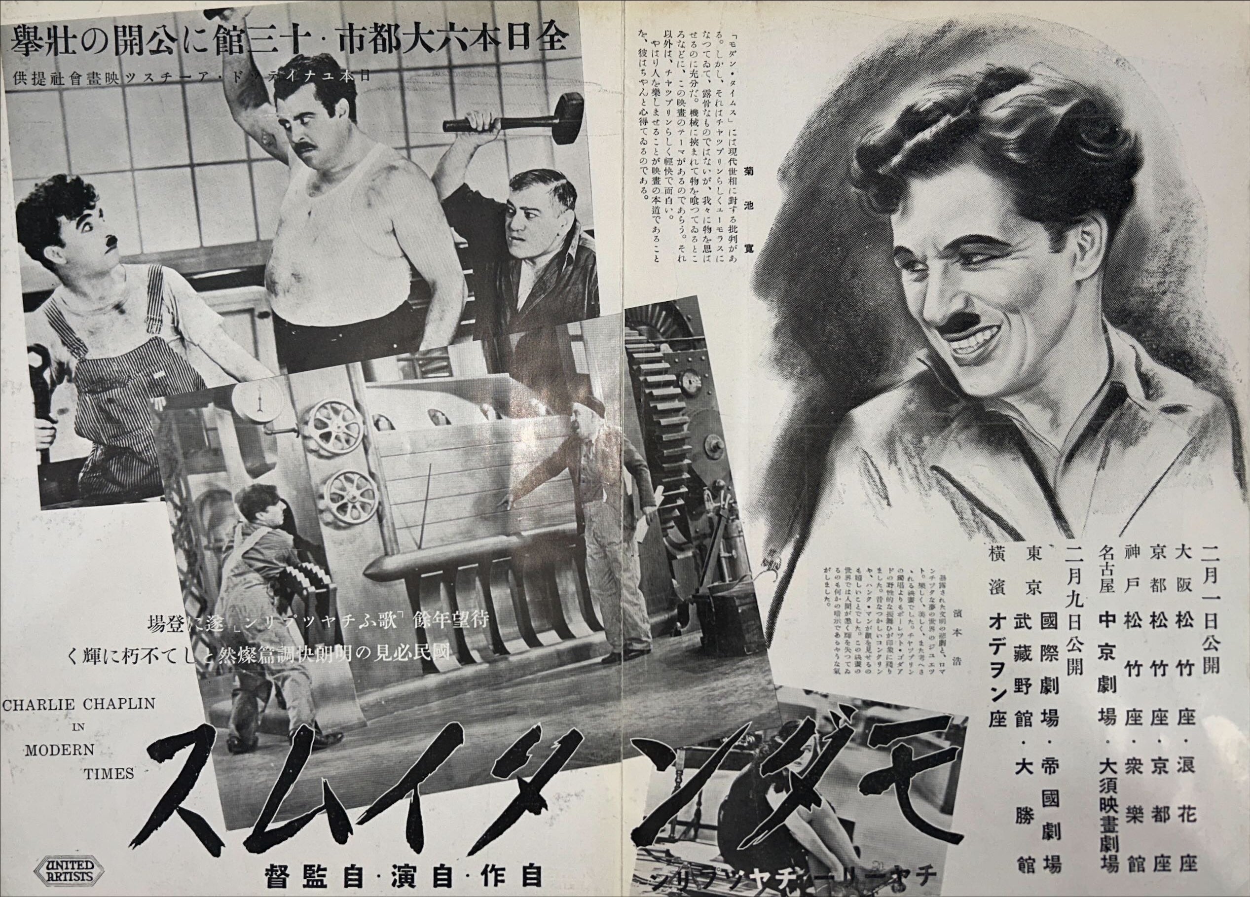 Original Japanese double‑sided folded advertising spread / promotional material for the 1937 Japanese first release (1937年日本初公開) of Charlie Chaplin’s masterpiece Modern Times—a scarce pre‑war survivor issued for United Artists / “Unite” distribution (ユナイト映画). This is period publicity paper (not a later reprint), likely cut from a magazine/program.