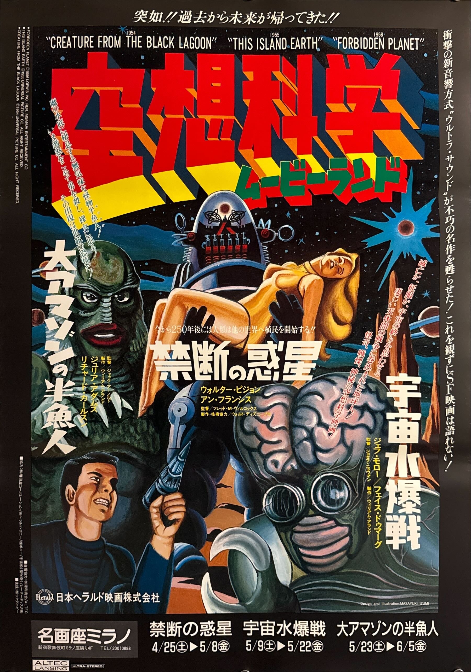 This is an original Japanese B2 poster, printed in 1980, for advertising a limited, theatre‑specific science‑fiction screening series titled 「空想科学ムービーランド」 (“Science‑Fiction Movie Land”). Rather than a nationwide film campaign, this sheet was produced to promote a special repertory engagement at 名画座ミラノ (Meigaza Milano) in Shinjuku—built around three immortal 1950s American sci‑fi titles, presented as a curated “event” with upgraded sound.
