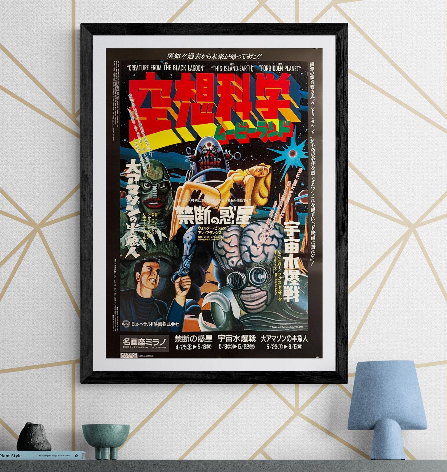 the Gill‑Man (Creature), the sleek space‑age heroine/robot imagery (Forbidden Planet), and the bulbous‑headed alien/brain‑tech menace (This Island Earth). -
