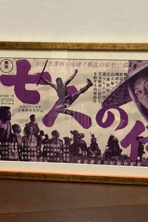 “Seven Samurai” (七人の侍) — Framed ULTRA RARE original Japanese first-release Toho campaign sheet (double-sided; four-fold) for Kurosawa’s 1954 epic — Sheet size 24.6 × 50.9 cm • Overall framed size 30 × 60 cm GA18