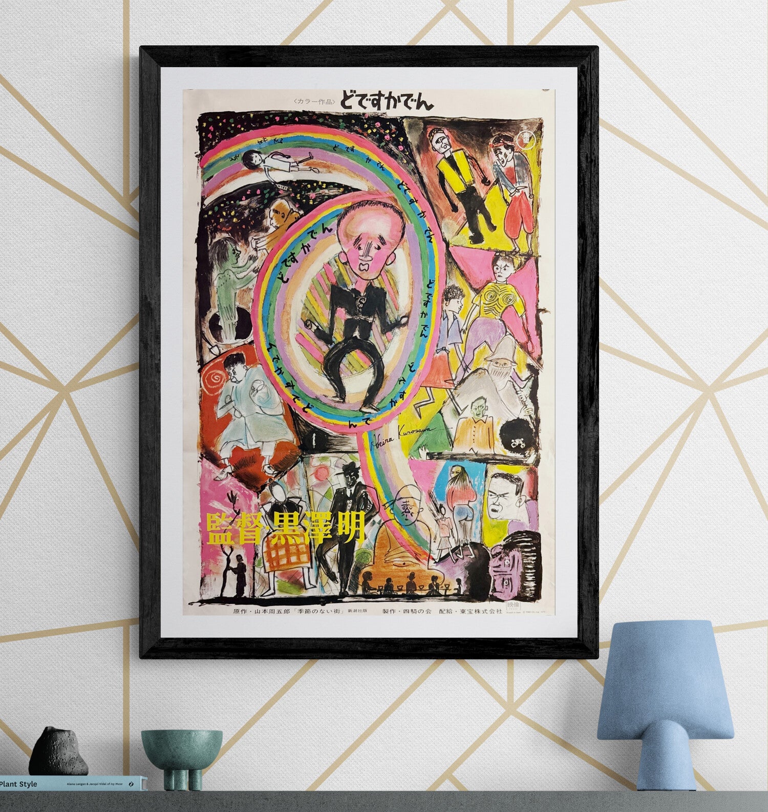 One of the most striking and collectible Kurosawa designs of the era: a vibrant, hand-drawn, almost childlike collage of characters and scenes, anchored by the rainbow-ring motif repeating the film’s title どですかでん around its arc. The sheet carries Kurosawa’s stylised signature “Akira Kurosawa” within the artwork and the bold yellow credit 監督 黒澤明 (“Directed by Akira Kurosawa”)—a stunning, gallery-ready composition and a true standout among 1970s Japanese film posters.