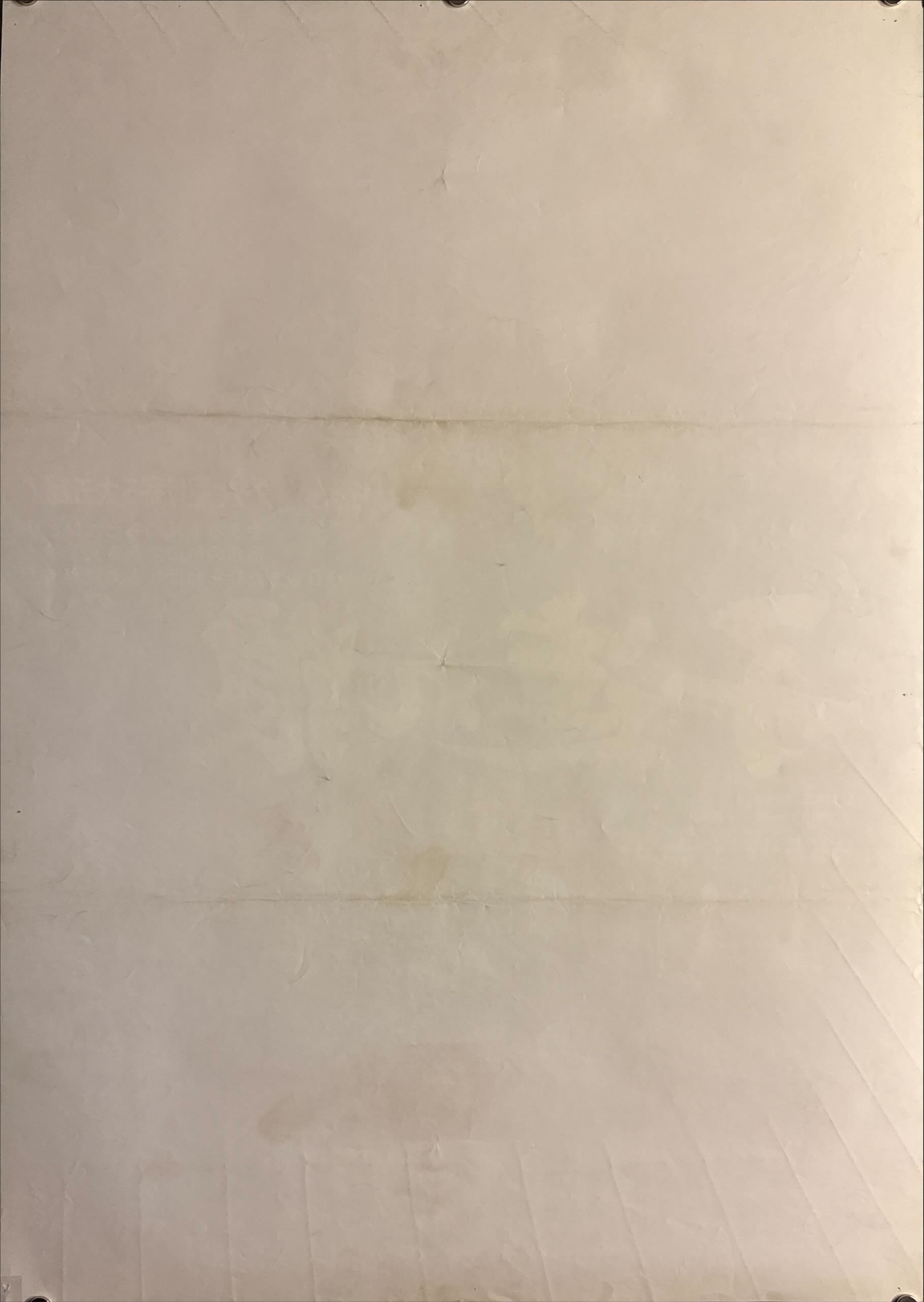 One of the most powerful Lone Wolf and Cub campaign designs: an immense monochrome close-up of Ogami Itto’s face fills the upper left, mirrored by Daigorō’s solemn child portrait at upper right—father and son rendered like fate itself. Below, three straw-hatted figures advance through shadow, while the title 「子連れ狼」 explodes across the centre in bold, brushy yellow, over the blood-red subtitle 「三途の川の乳母車」. The lower section erupts into painterly action—swords drawn, bodies tumbling—capturing the film’s relentless combat energy. A dramatic, museum-grade B2 with enormous wall presence.