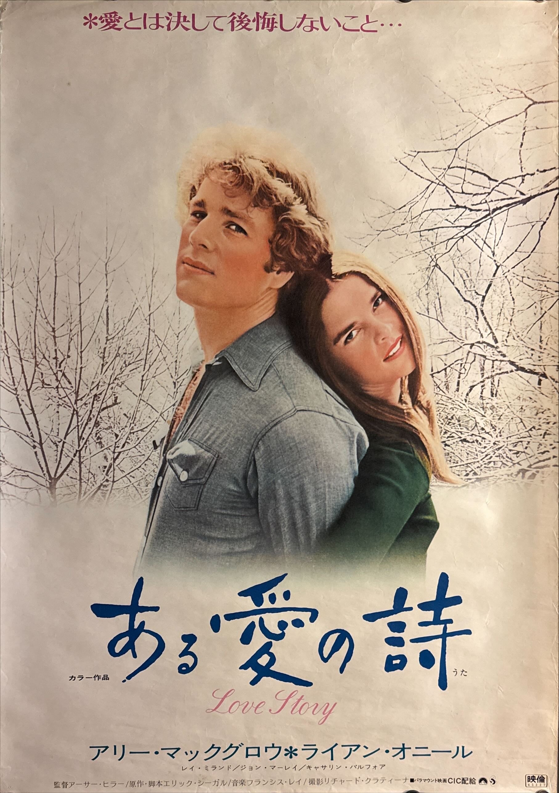 A beautifully restrained Japanese B2 that leans into soft winter melancholy: the couple are shown back-to-back in gentle, diffused light, framed by bare branches and a pale, snowy atmosphere. The title 「ある愛の詩」 is rendered in large, expressive brush-style blue calligraphy, with the English Love Story beneath in delicate script. At the top, the tagline reads 「*愛とは決して後悔しないこと…」 (“Love means never having to say you’re sorry…”), anchoring the film’s emotional hook in a single line. Minimal, elegant, and extremely displayable.