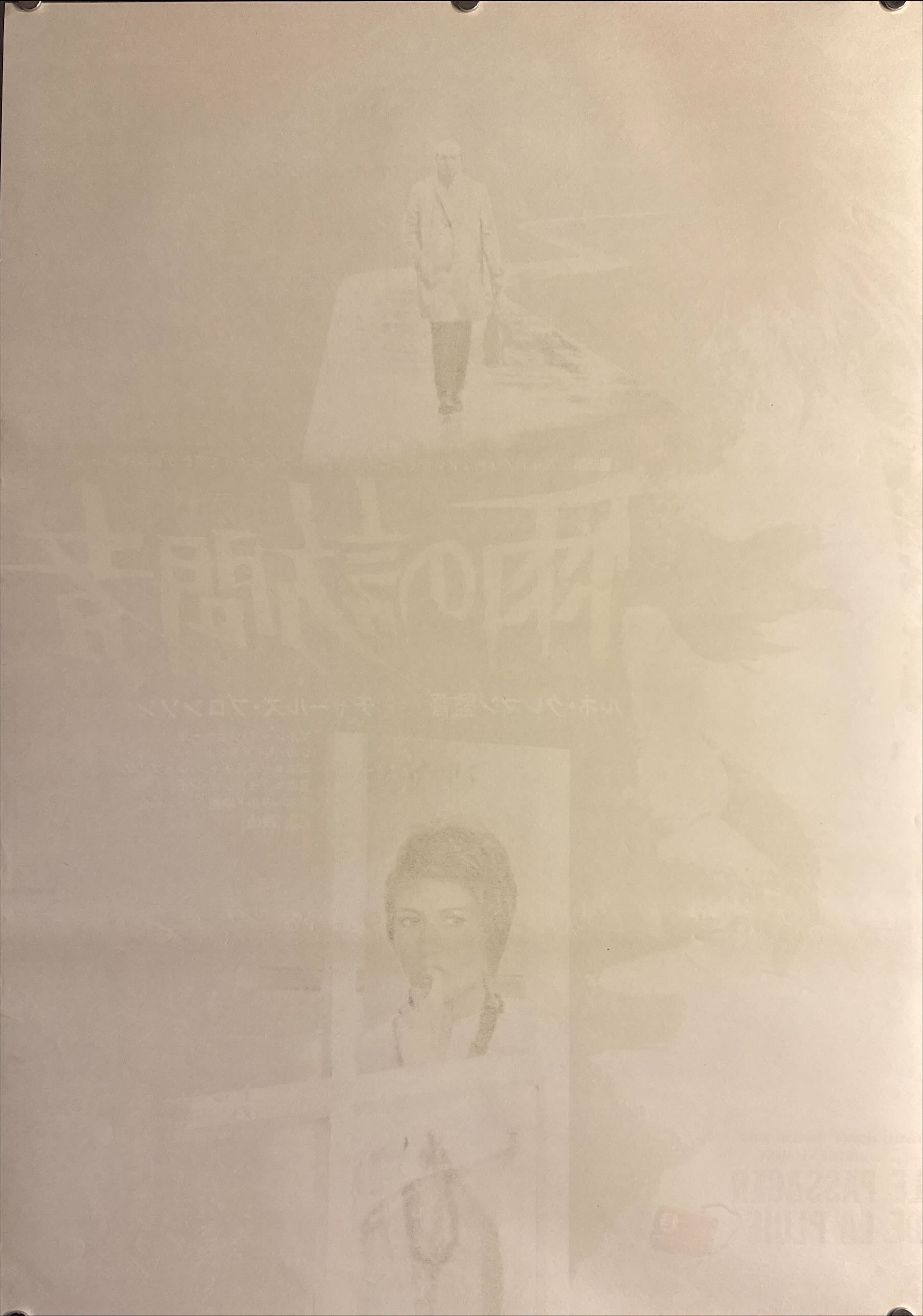 A superb example of Japanese B2 sophistication—graphic, minimal, and emotionally charged. A lone figure walks a pale, winding road through falling rain, carrying a vivid red bag that becomes the poster’s key accent. The title 「雨の訪問者」 is rendered in aggressive, brush-stroke yellow typography across a deep blue-grey field, while a large, ghosted profile silhouette adds a sense of looming psychological pressure. Below, a window-framed still of Marlène Jobert—finger to lips—suggests secrecy and threat, reinforced by vertical Japanese copy promising “sharp suspense.” Elegant, modern, and exceptionally displayable.