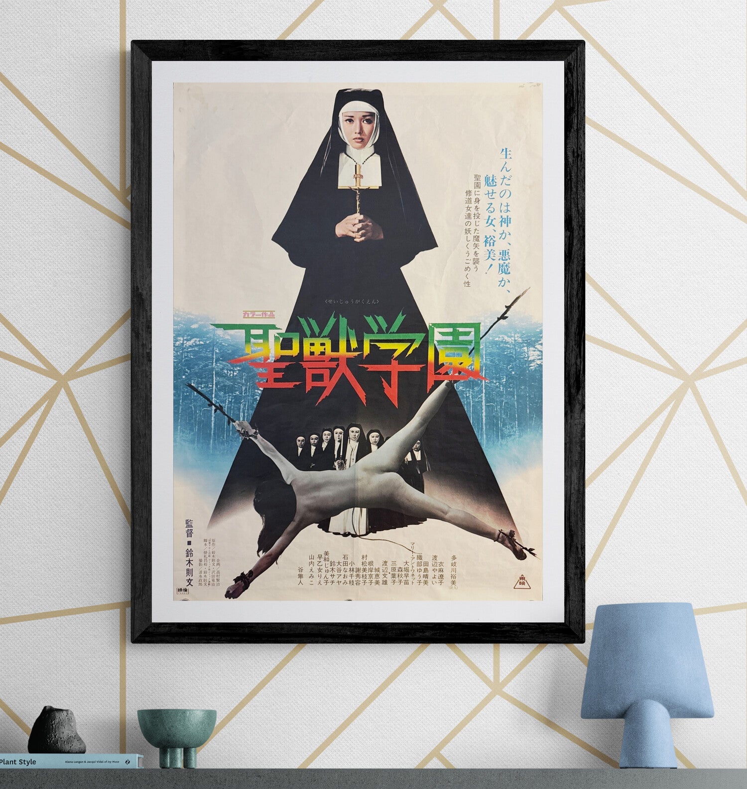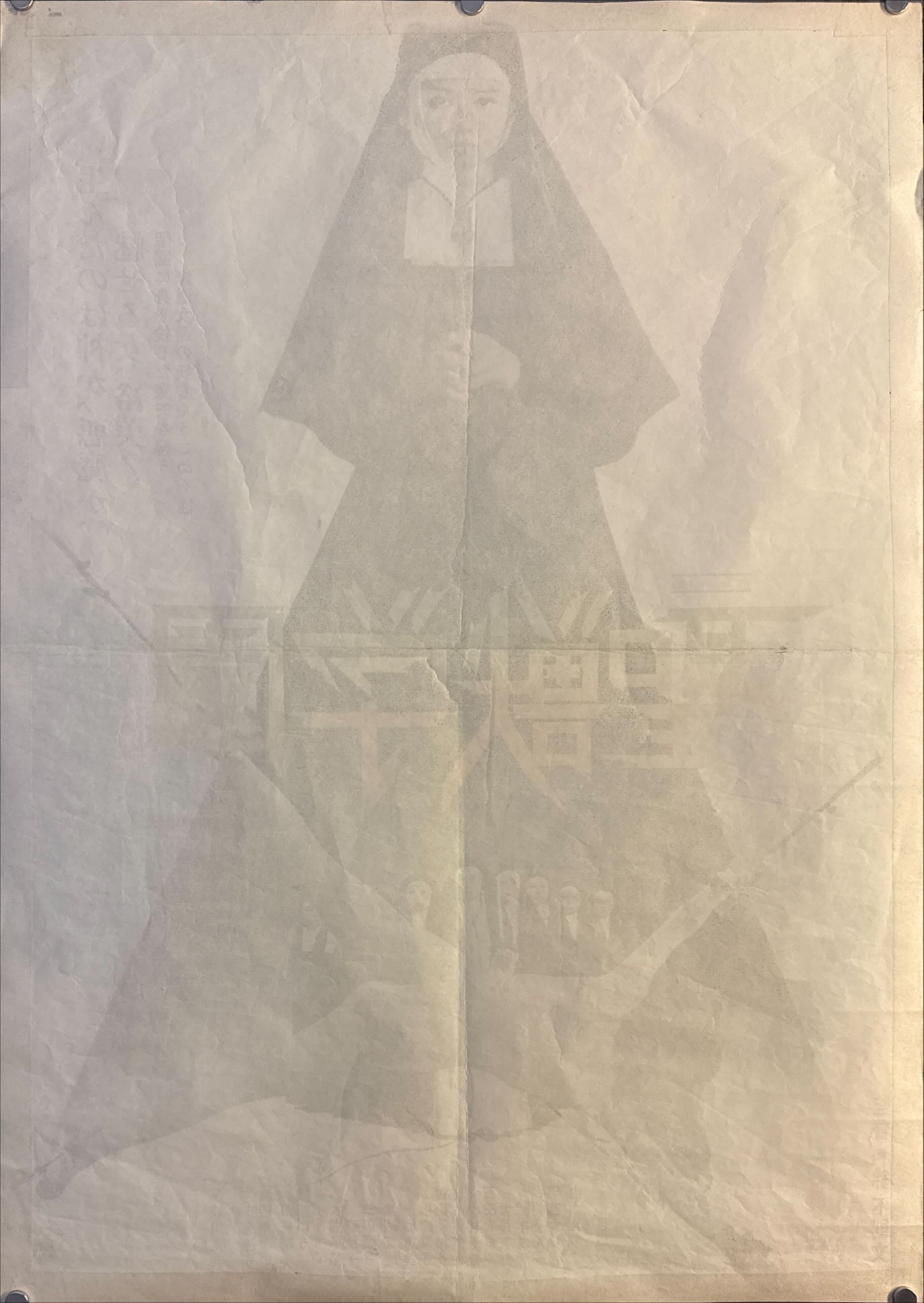 A spectacularly confrontational B2 dominated by stark Catholic imagery and graphic contrast: a central, front-facing nun holds a crucifix like an accusation, her black habit forming a monolithic silhouette against a pale field. Across the midsection, the title 「聖獣学園」 slashes the composition in aggressive, multicolour typography, with a cold blue forest band running behind it to heighten the sense of isolation and menace. Below, a near-surreal nude figure is shown stretched and bound—an extreme visual hook—while a line of nuns gathers in the shadows beneath the habit, reinforcing the film’s themes of secrecy, power, and taboo. It’s a quintessential 1970s Japanese exploitation one-sheet: bold, symbolic, and designed to stop you in your tracks.