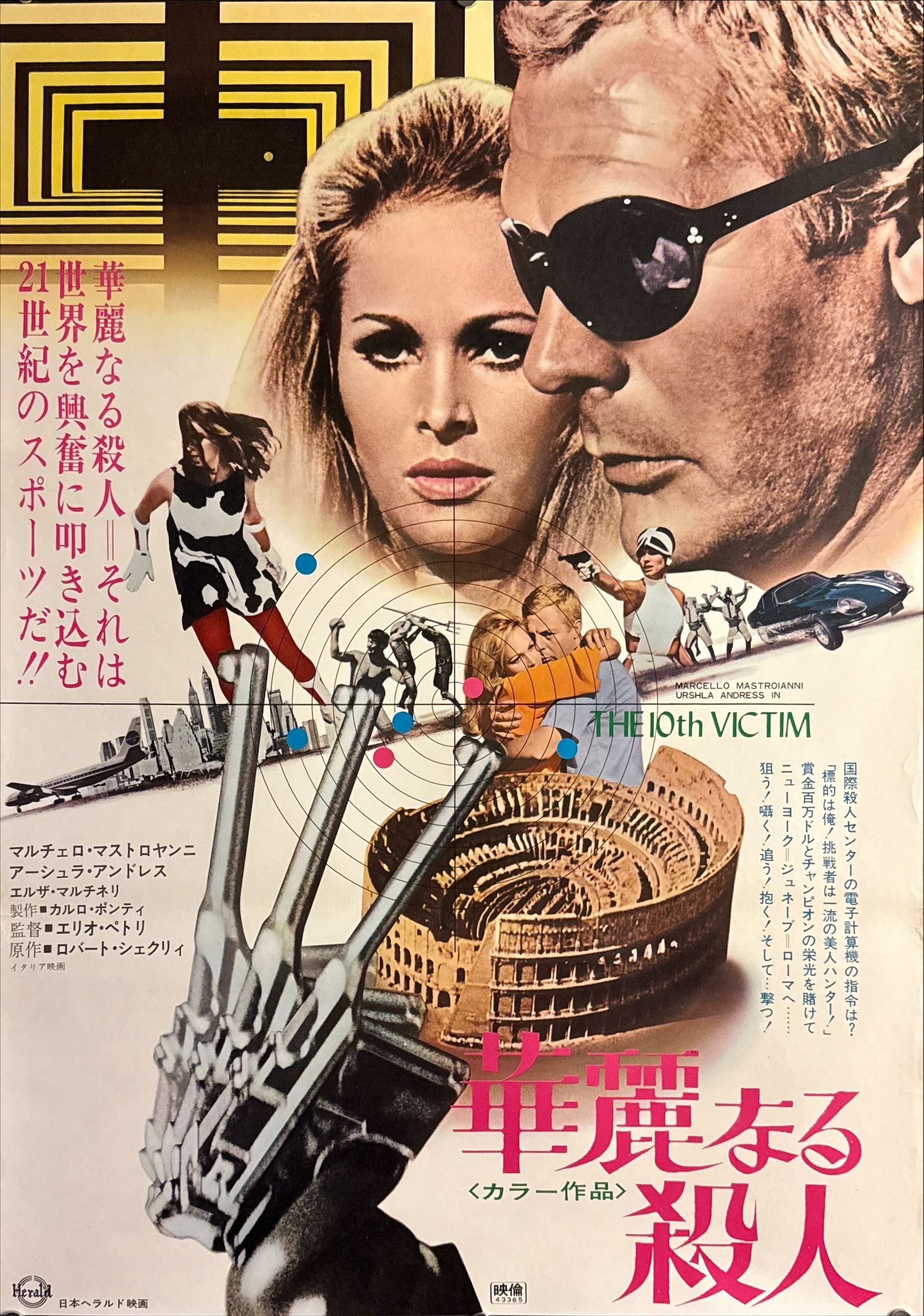 This is an original Japanese B2 movie poster printed in 1966 for the first Japanese theatrical release of The 10th Victim (華麗なる殺人 / La decima vittima), a Italy / France futuristic pop-satire directed by Elio Petri, starring Marcello Mastroianni and Ursula Andress.