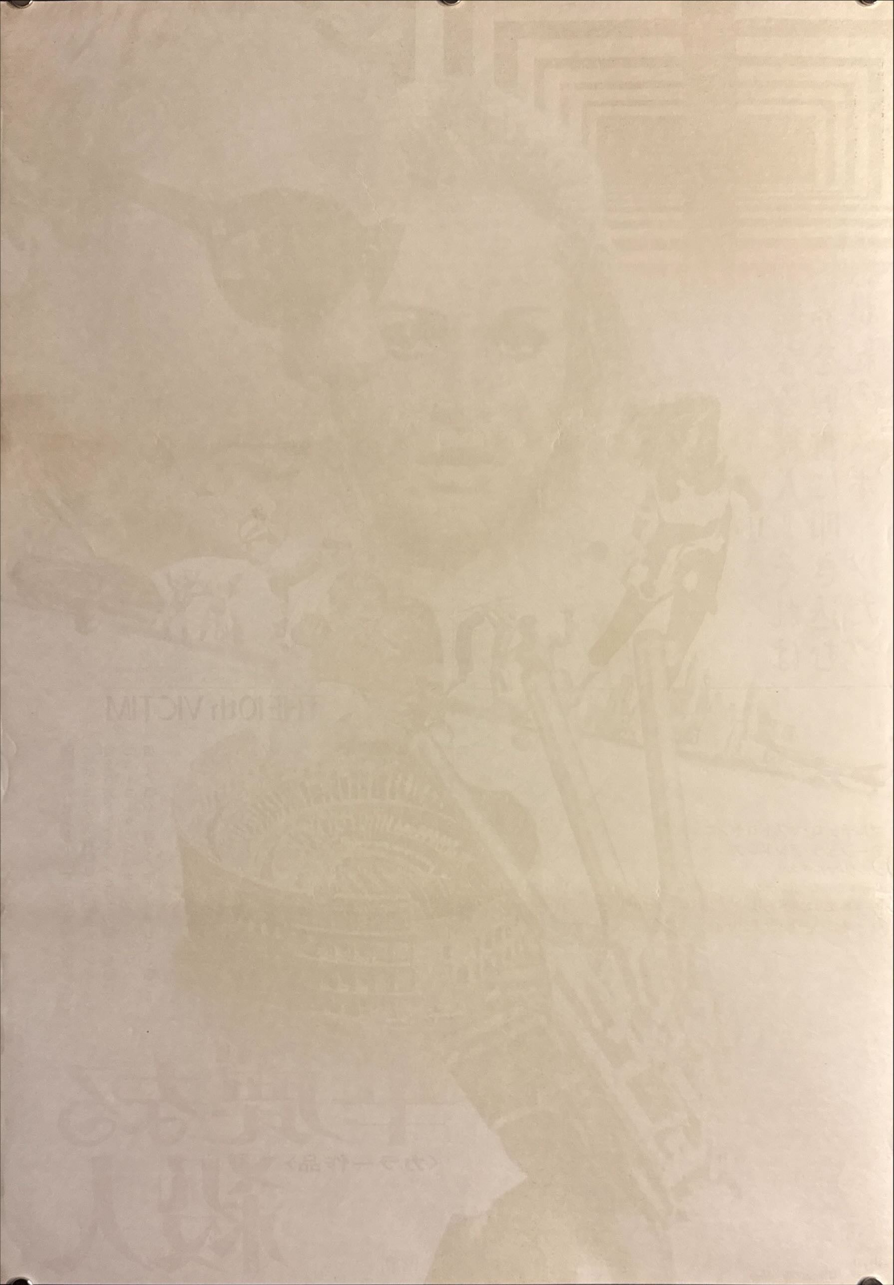 A sensational Japanese B2 packed with mod-era visual punch: oversized close-ups of Andress and Mastroianni dominate the upper field, stylised with sharp glamour lighting and graphic patterning. Below, a target reticle overlays a romantic embrace, while futuristic silhouettes and a sleek car suggest the film’s weaponised pop world. The Colosseum anchors the Rome setting, and the dramatic foreground is seized by an enormous chrome gun-barrel/weapon graphic thrusting toward the viewer—pure 1960s design bravura. Bold pink title typography 「華麗なる殺人」 finishes the sheet like a fashion headline. An exceptional, highly displayable piece of Japanese pop-sci-fi marketing.