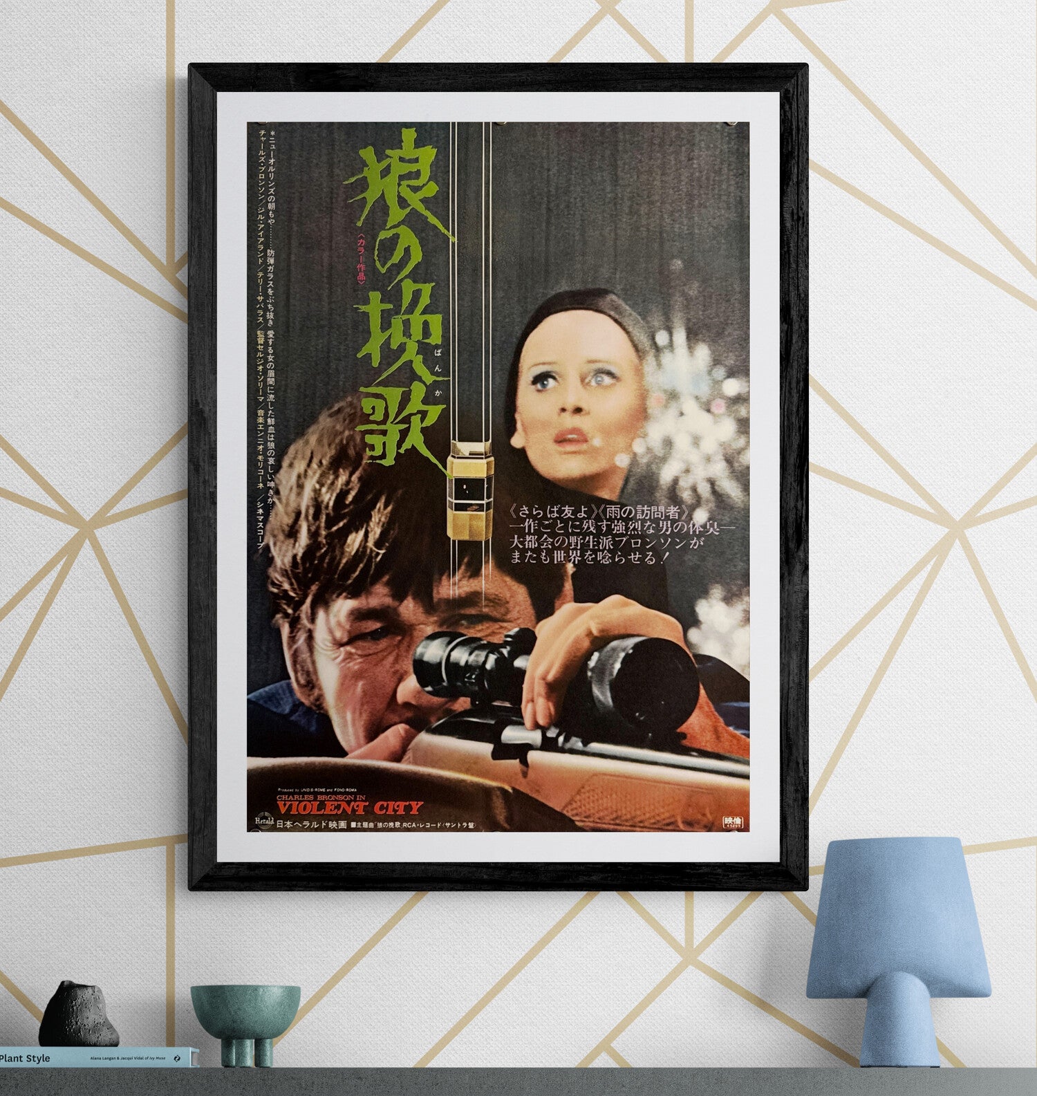 A striking, high-impact Japanese design that weaponises minimalism and tension. The composition is split by a vertical gun barrel running like a dividing line through the frame, while Bronson fills the lower half—eye pressed to a rifle scope, face bruised and resolute. Above and to the right, Jill Ireland’s wide-eyed portrait floats in soft focus against city lights, adding glamour and threat. The title 「狼の挽歌」 appears in bold, brush-like green calligraphy down the left, instantly memorable against the dark ground. At bottom, the English credit “CHARLES BRONSON IN VIOLENT CITY” anchors the sheet—one of those superb Japanese B2s where typography and imagery feel perfectly “designed,” not merely advertised.