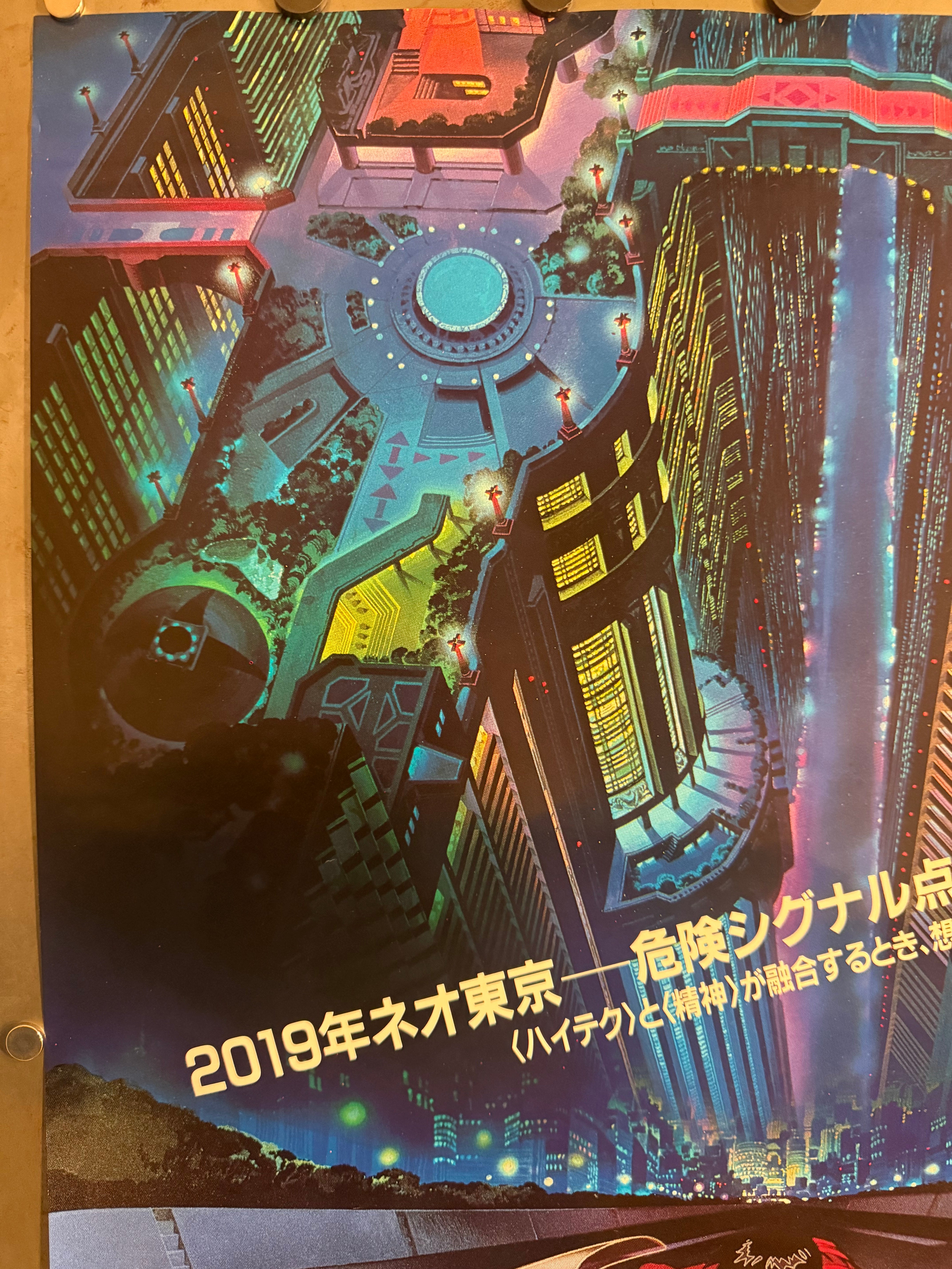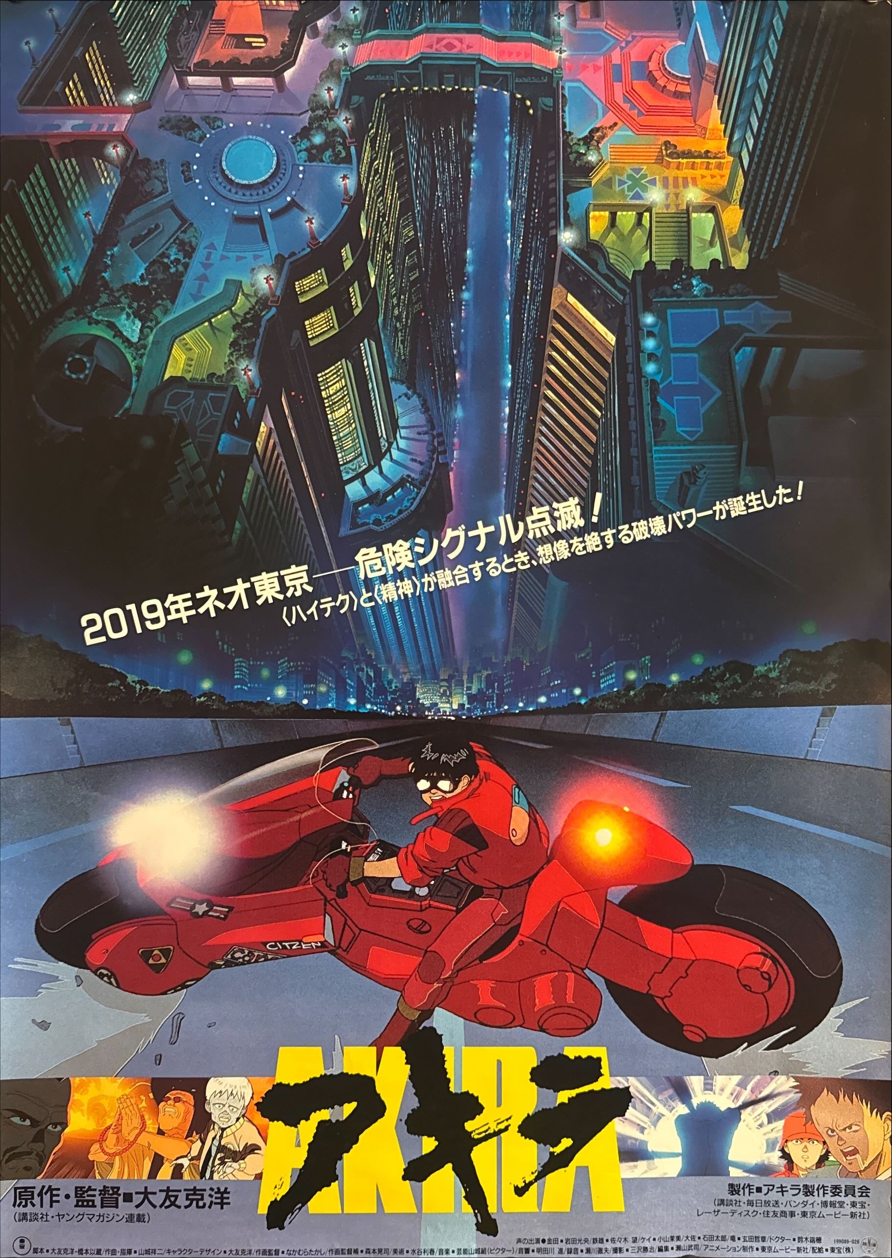 A bold, cinematic composition built around scale and speed. The upper half plunges you into Neo-Tokyo from above—a vertiginous aerial cityscape rendered in electric blues, teals, and hot neon highlights, with architecture and light grids collapsing into a central vertical corridor like a futuristic canyon. Across this skyline, the famous tagline lands in Japanese: 「2019年ネオ東京—危険シグナル点滅!」 (“2019 Neo-Tokyo—Danger signals flashing!”), instantly placing the viewer inside Akira’s ominous near-future. The lower half detonates into motion: Kaneda leans hard into a turn on the iconic red bike, headlight blazing, the machine’s sculptural bodywork and “CITIZEN” detail reading sharply against the night highway. Along the bottom edge, a strip of character and explosion vignettes foreshadows the film’s psychic violence and societal collapse, while the massive yellow AKIRA title is slashed through in aggressive black brush-stroke typography—pure Otomo-era graphic attitude. It’s an unforgettable, display-forward design that feels like a capsule of late-1980s Japanese futurism.