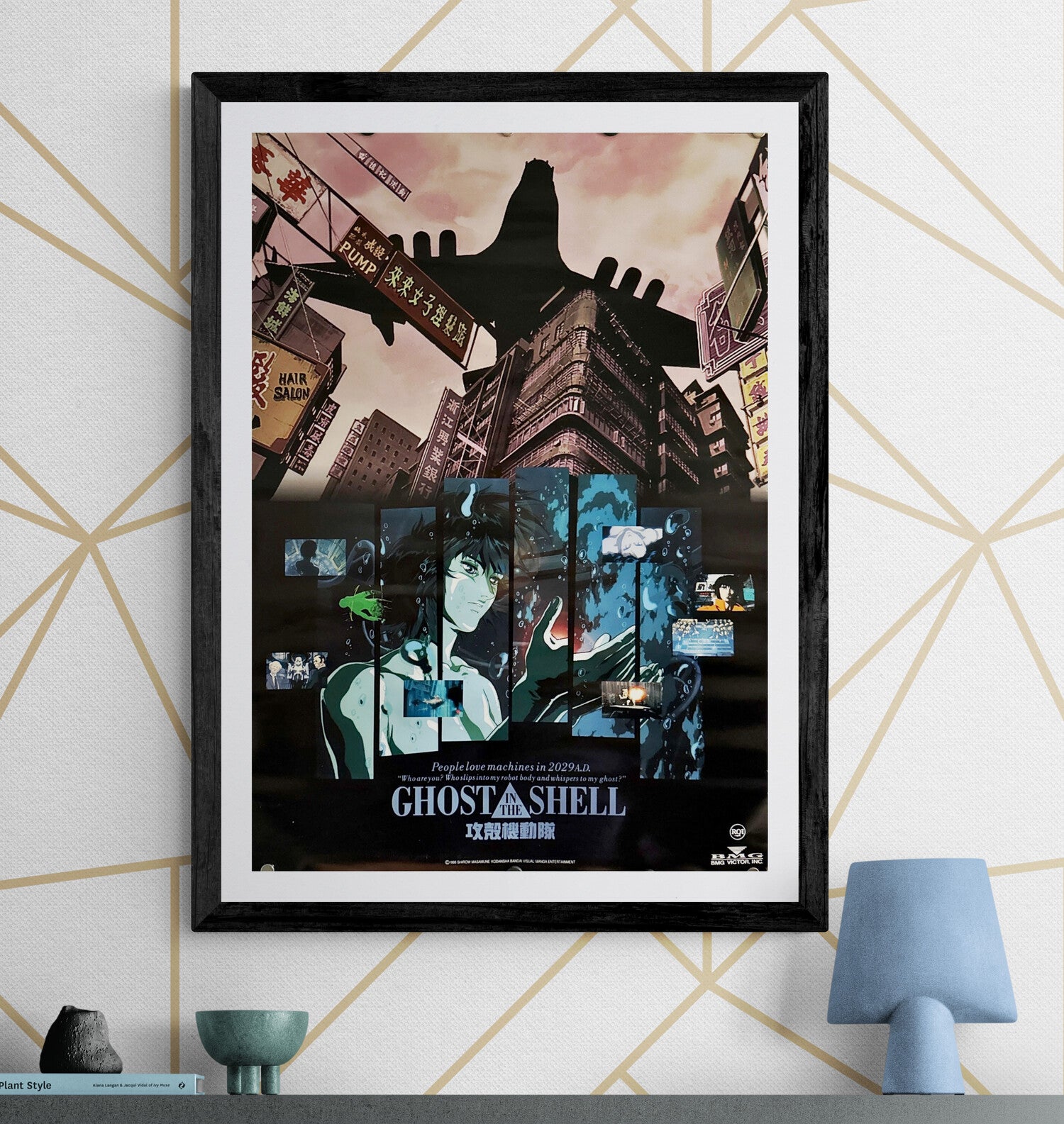 Neo‑noir Hong Kong‑style canyons glow under a rose sky while a looming aircraft silhouette cuts across the signage. Along the lower half, vertical panes reveal Major Motoko Kusanagi’s emergence in the “birth tank,” intercut with micro‑vignettes from the film. Bilingual title work—GHOST IN THE SHELL / 攻殻機動隊—sits above the line: “People love machines in 2029 A.D. ‘Who are you? Who slips into my robot body and whispers to my ghost?’”—a perfect encapsulation of the film’s mythic tone.