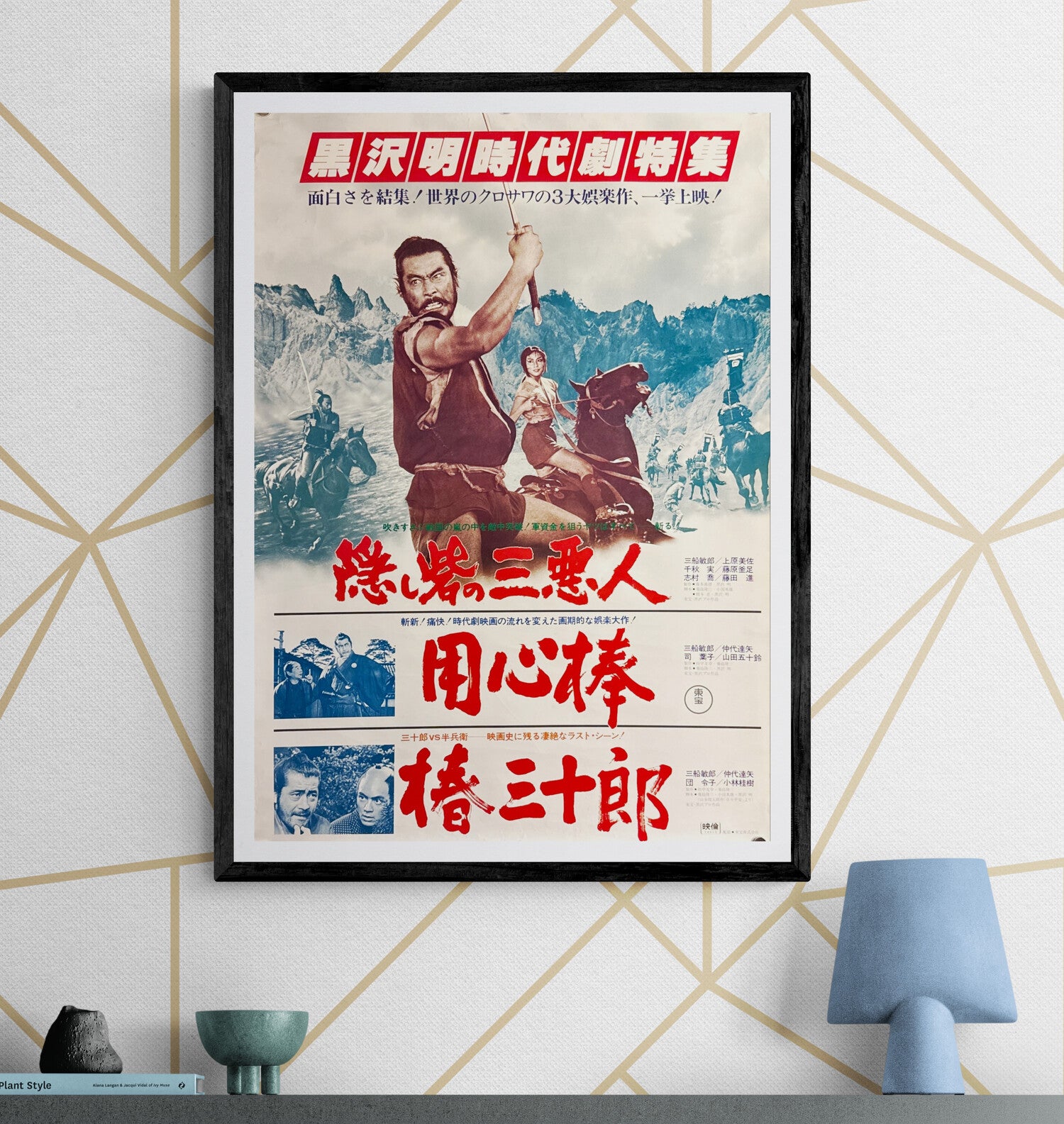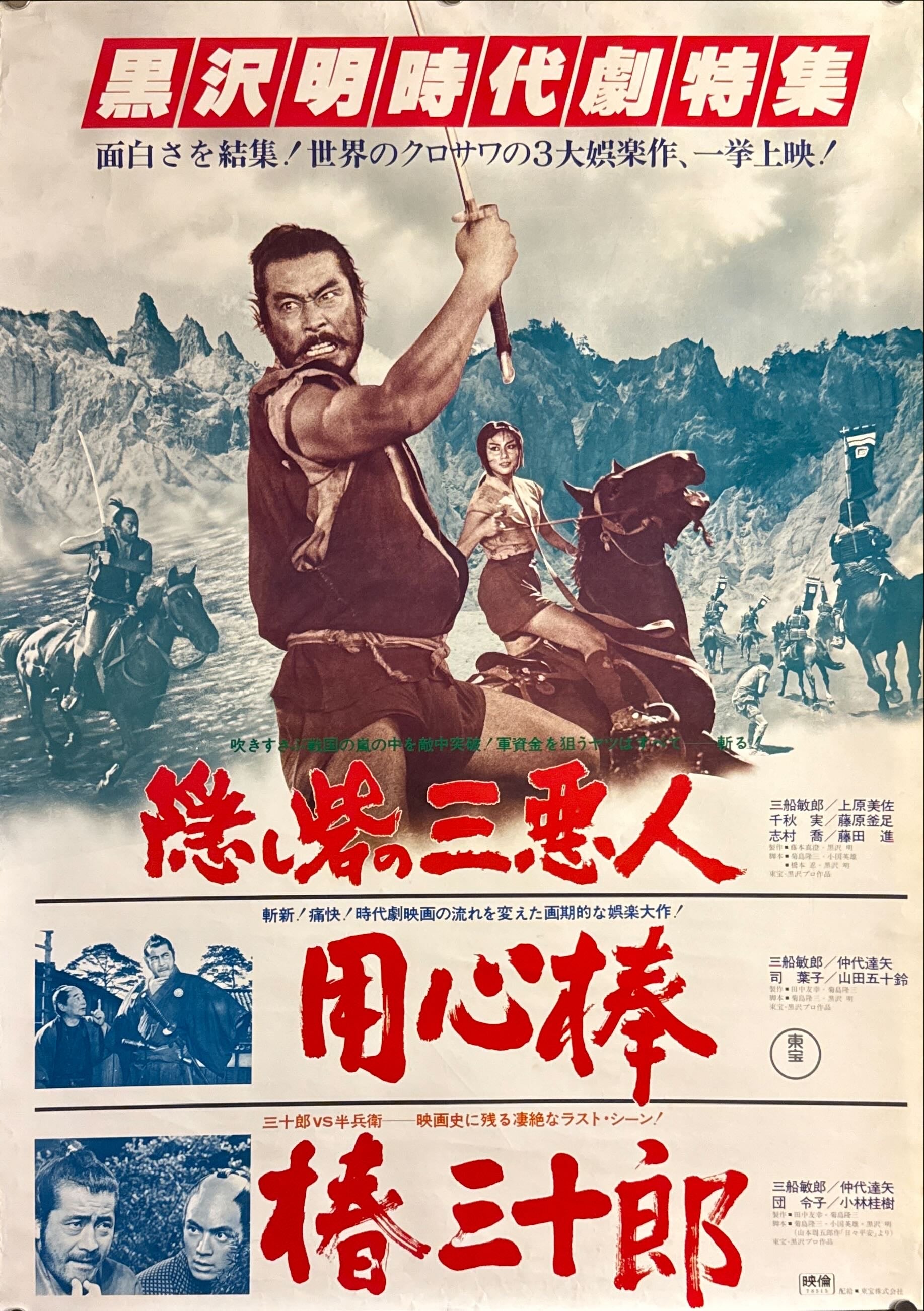 A superb, cinema-forward composition built like a triple-bill of impact: the top half explodes with dynamic action imagery and bold red festival-style typography, while the stacked title blocks below spotlight the film’s core characters and dramatic tension. Mifune is front and centre—fierce, commanding, and instantly recognisable—balanced by the striking presence of Misa Uehara, with smaller vignette stills anchoring the narrative beats. The overall effect is loud, graphic, and unmistakably late-Showa in tone: a reissue poster designed to sell the spectacle, not merely decorate.