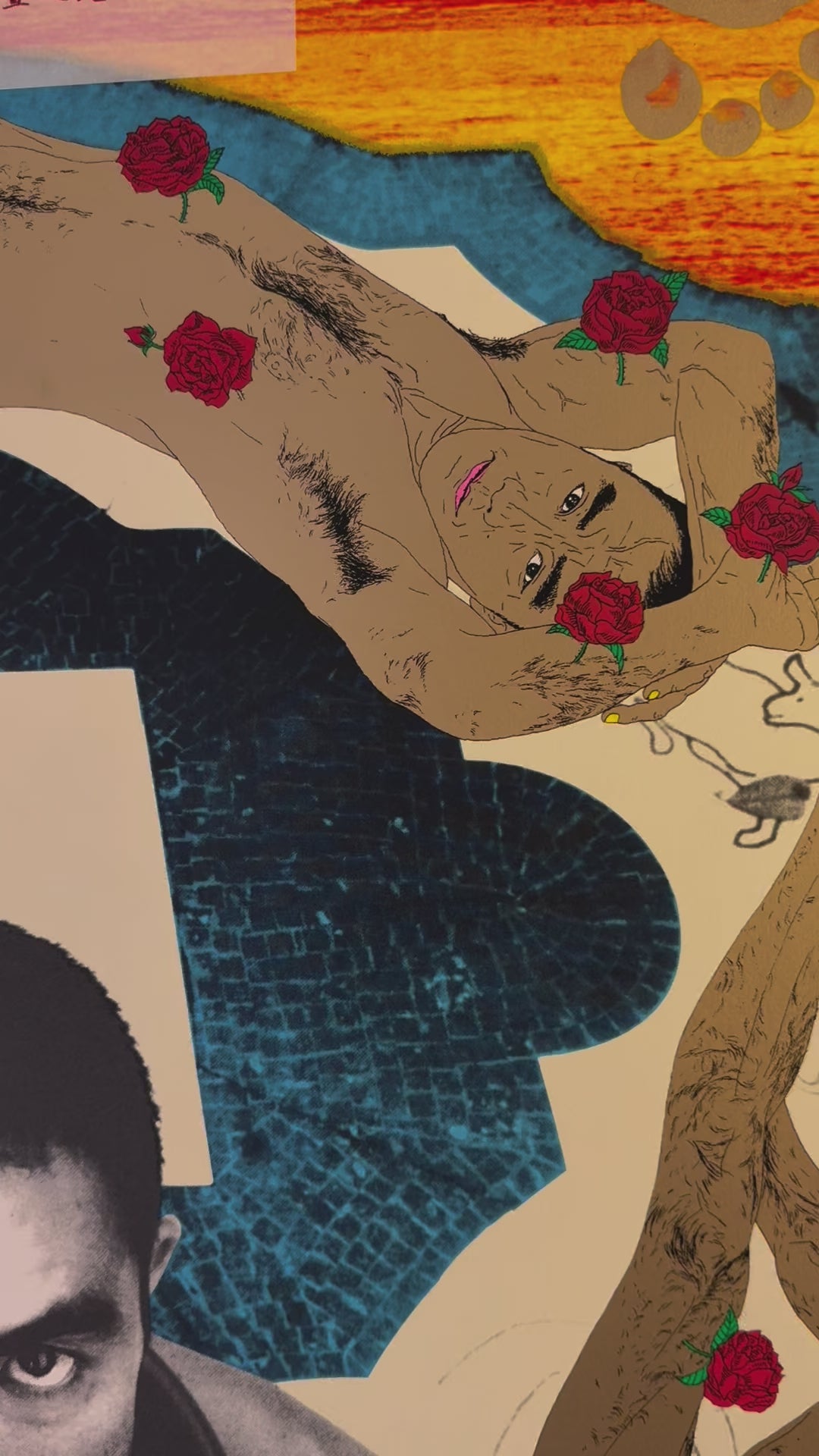 The composition boldly fuses Hosoe’s stark black-and-white photography of Mishima—here shown gripping a large hammer between his teeth—with Yokoo’s surrealist and psychedelic aesthetic. Encircling the central image are five reclining nude male figures, rendered in flat, illustrative style and adorned with vibrant red roses, symbolizing beauty, eroticism, and martyrdom. The setting hints at a tiled pool or temple, with mosaic-like textures and dreamlike sunset tones. The overall visual language is erotic, mythic, and spiritually intense—fitting for Mishima’s persona.