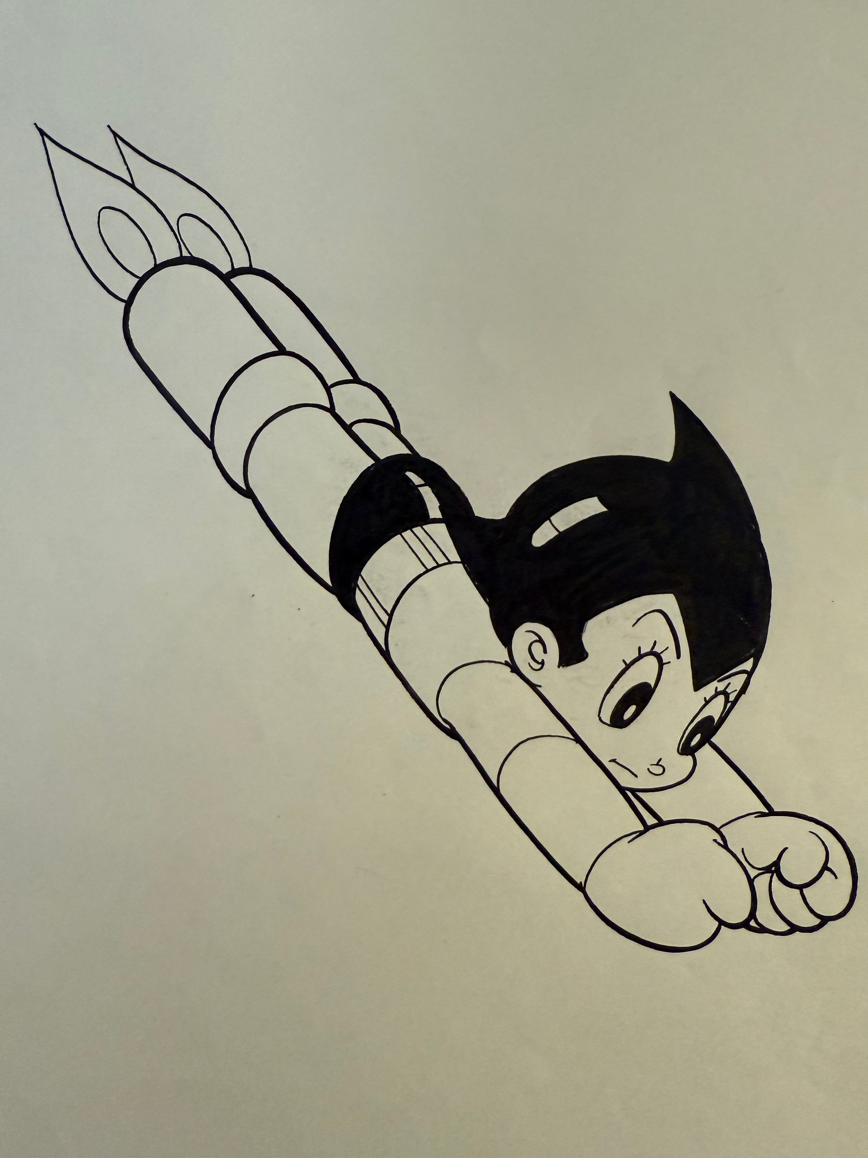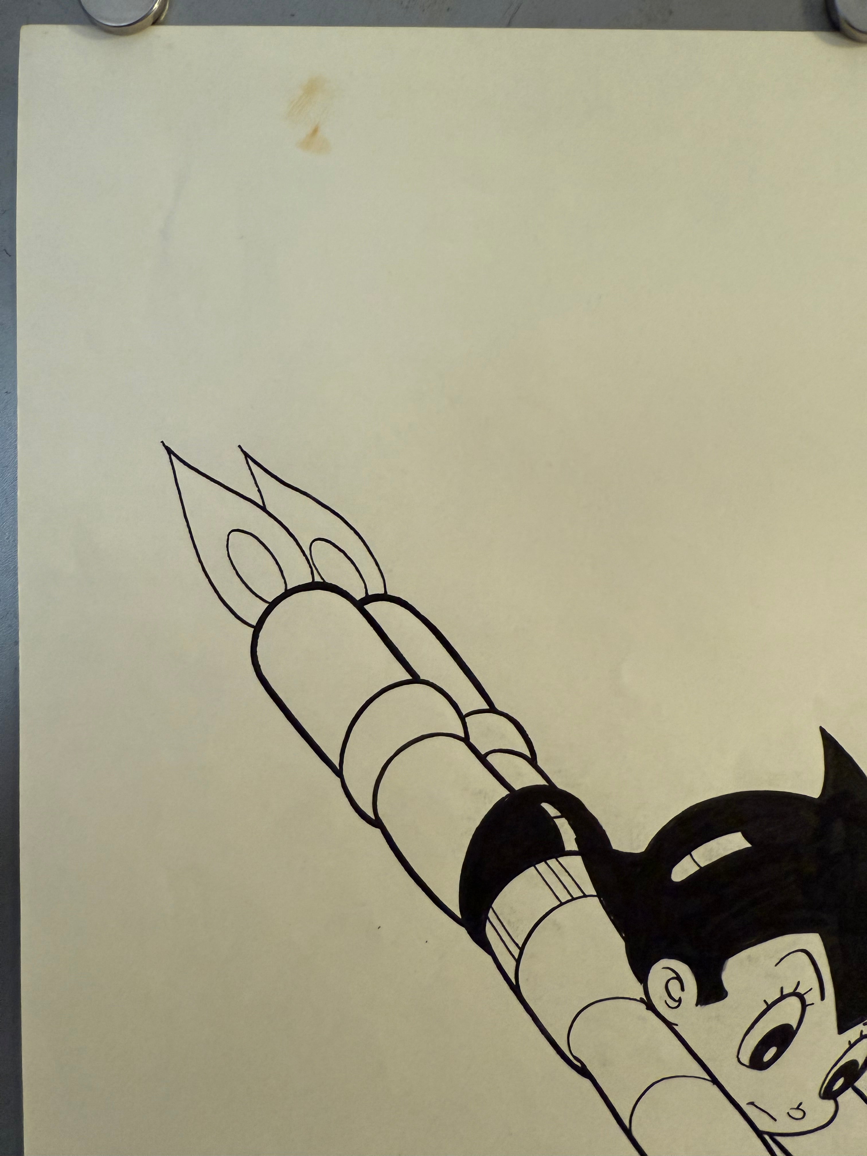 This is an original, studio‑produced ink drawing of Astro Boy, rendered in bold black lines on thin cream‑toned drawing paper. Astro is depicted in his iconic flying pose, fists forward with segmented robot limbs and twin rocket flames trailing behind.