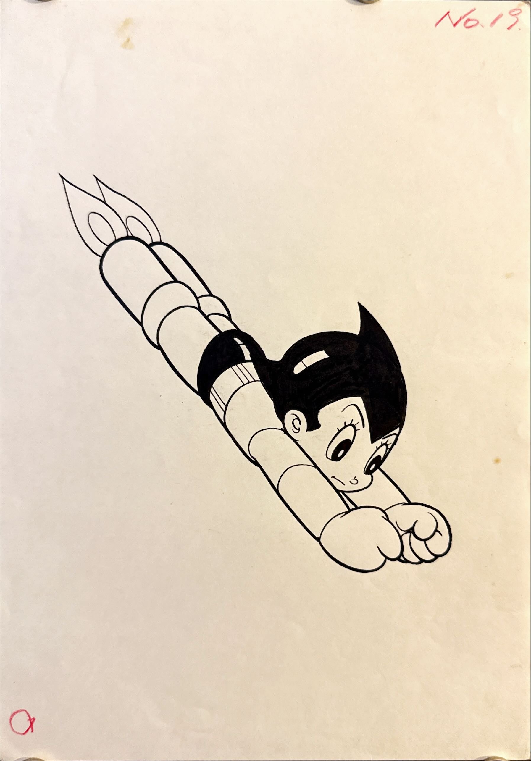 One‑of‑a‑kind hand‑drawn ink illustration of Astro Boy (Tetsuwan Atom), from the 1980s–1990s, showing his classic flying pose. Studio line art on thin slightly larger than B5‑size drawing paper with red pencil “No.19” and approval mark. Japan Poster Shop COA included.