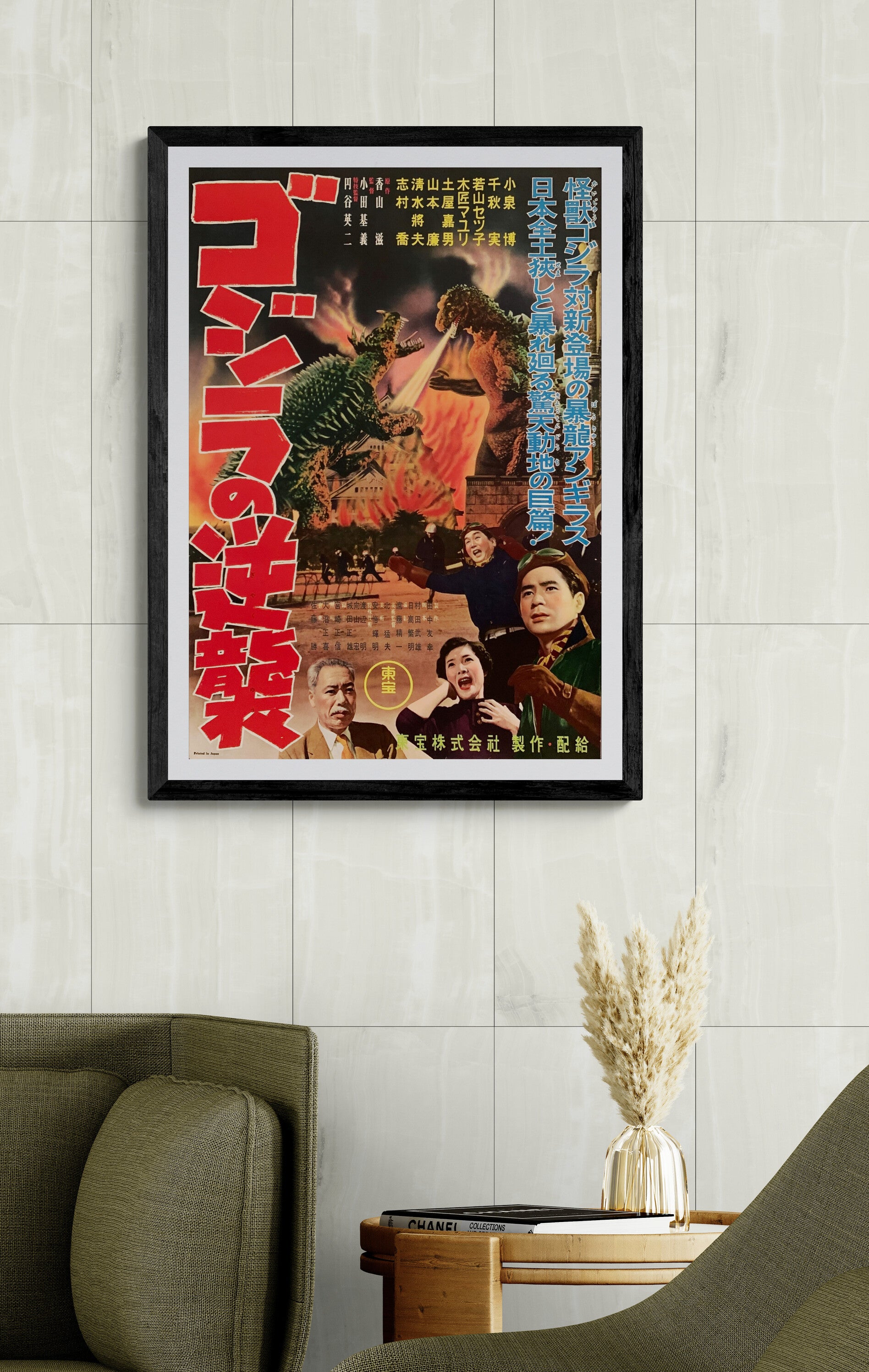 • Monumental vertical title typography: the towering red ゴジラの逆襲 reads like painted signage—aggressive, immediate, unforgettable.