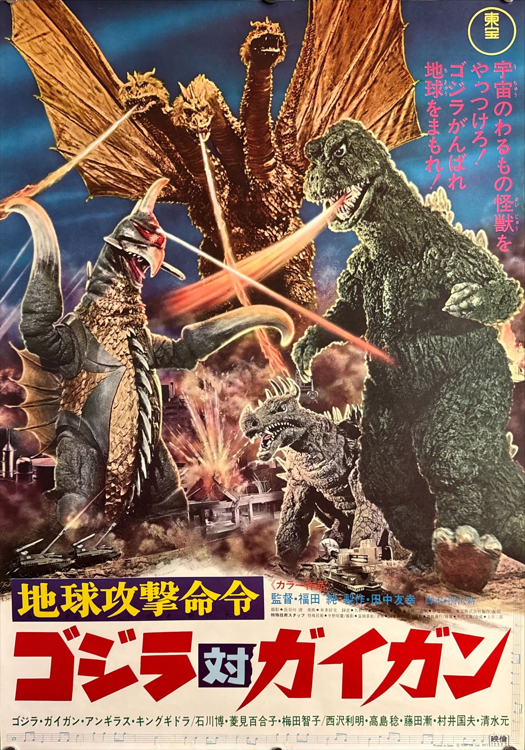 This is an original Japanese B2 theatrical poster printed in 1972 for the first release of Godzilla vs. Gigan (地球攻撃命令 ゴジラ対ガイガン), produced and distributed by Toho. First-release posters for this title are especially sought-after thanks to the film’s cult reputation—pure early-70s Showa energy with an all-time classic new villain and some of the most exuberantly “comic-book” kaiju action of the era.