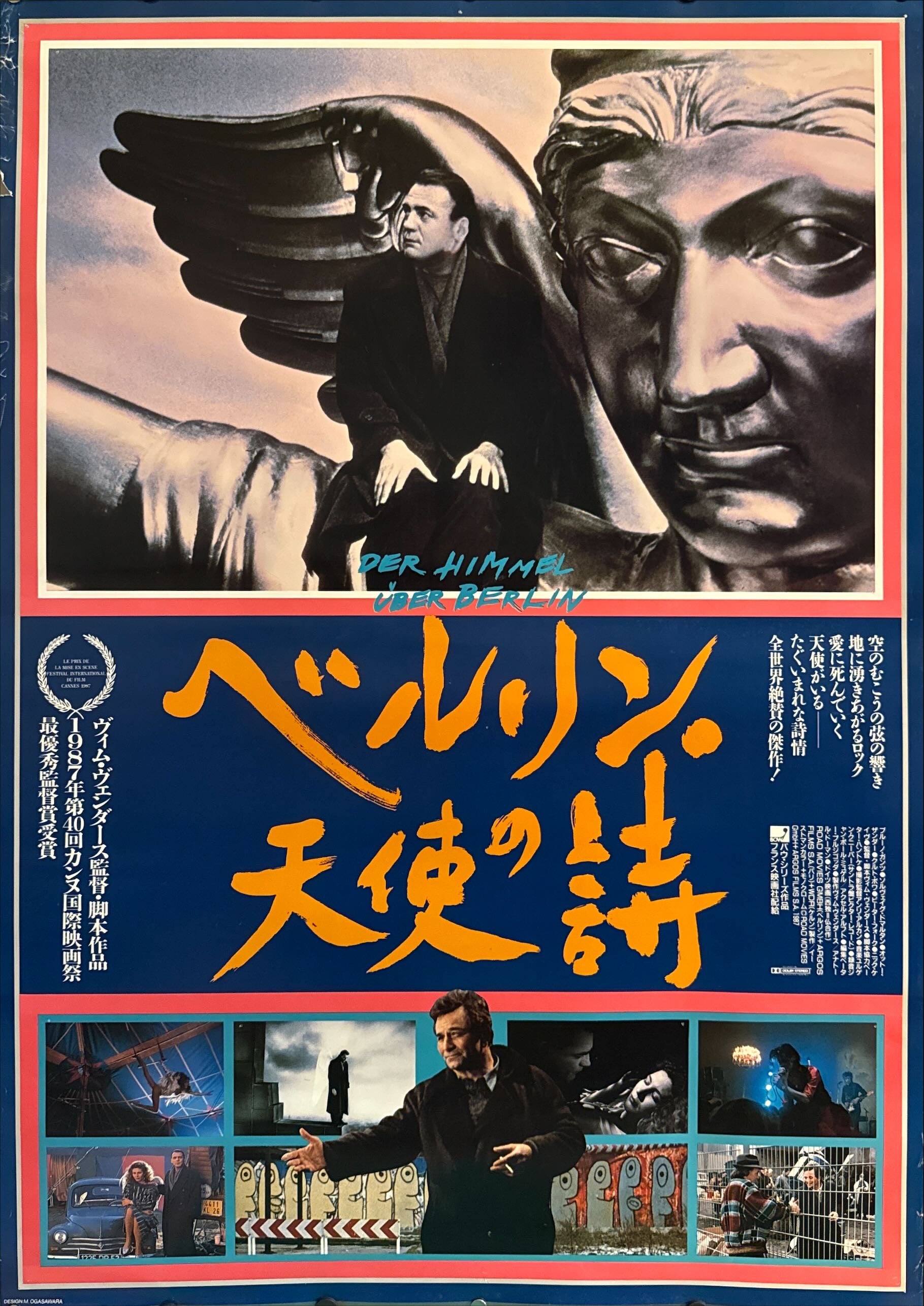 This is an original Japanese B1 theatrical poster from the first Japanese release of Wim Wenders’ acclaimed masterpiece Wings of Desire (original title: Der Himmel über Berlin). The film’s Japanese first release date is documented as April 23, 1988, and this poster design prominently spotlights its international prestige on release.