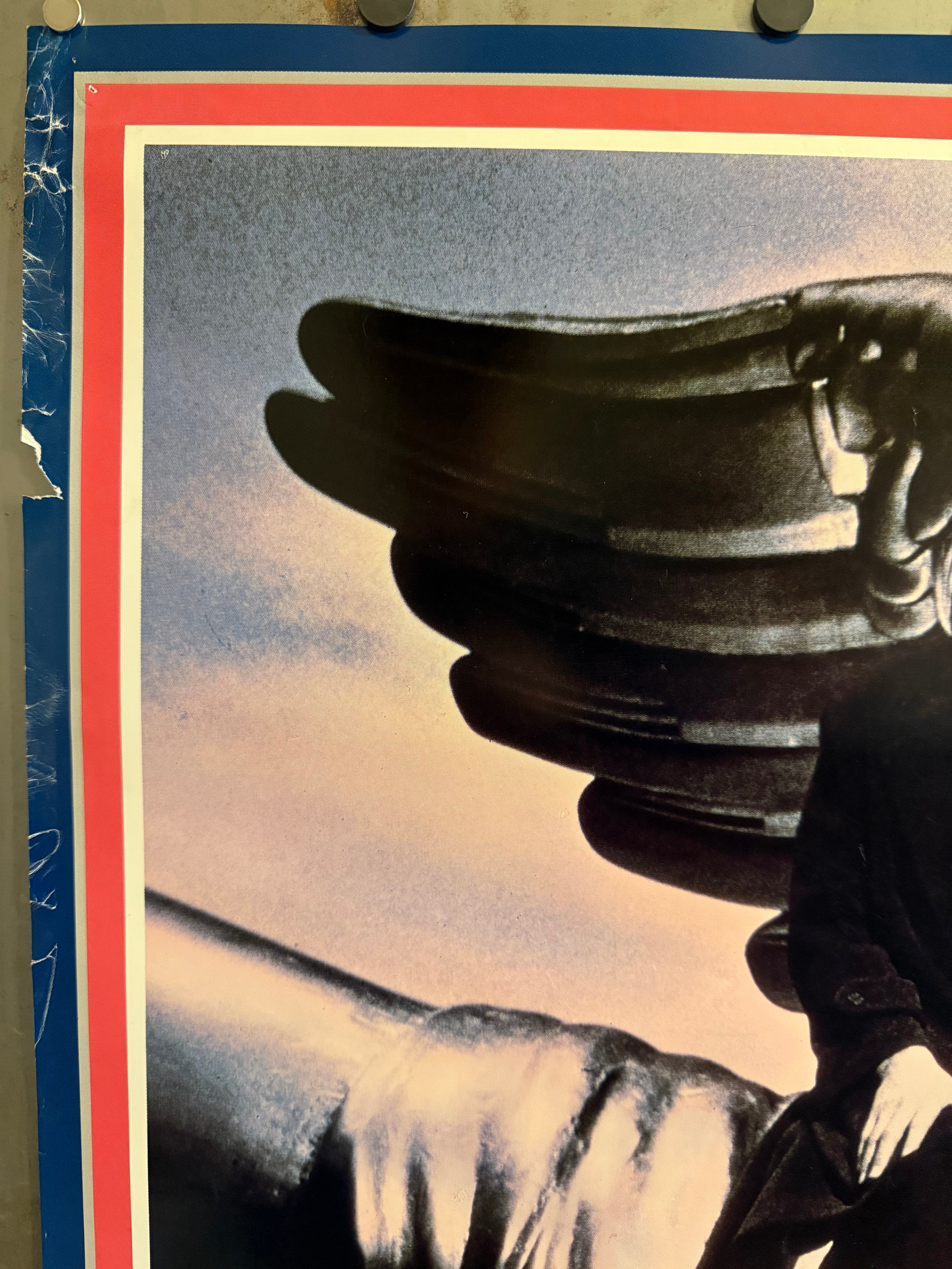 Very good, consistent with age and prior theatrical handling. This example presents strongly, but shows visible edge wear and scuffing, including notable wear/tearing with paper loss along the left blue border (most noticeable near the upper-left). The reverse is blank. Please review the photos (front and back); they show the exact poster for sale.
