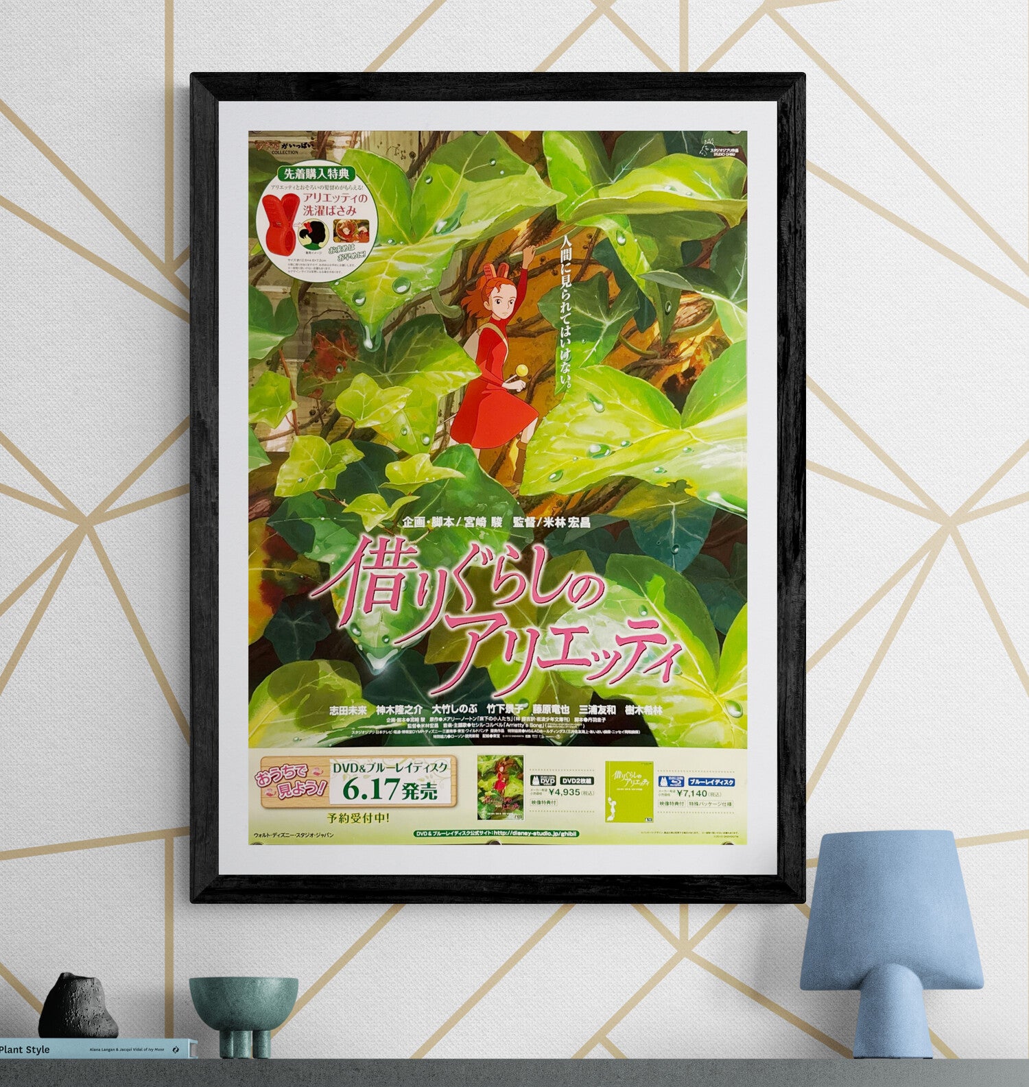 This is an original Japanese B2 poster printed in 2011 to promote the first DVD & Blu-ray release of The Secret World of Arrietty (借りぐらしのアリエッティ), the Studio Ghibli feature planned and scripted by Hayao Miyazaki and directed by Hiromasa Yonebayashi, adapted from Mary Norton’s novel The Borrowers.