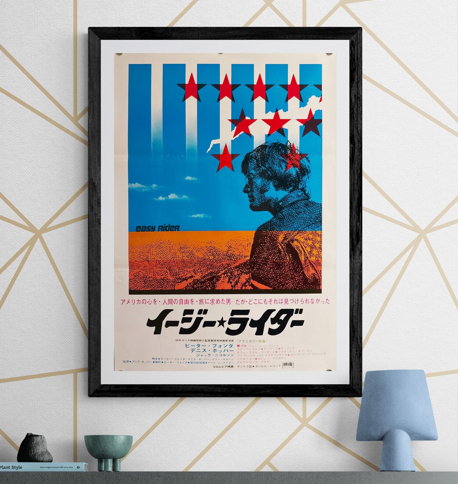 This is an original Japanese B2 poster printed in 1969 for Dennis Hopper’s counterculture landmark Easy Rider, starring Peter Fonda, Dennis Hopper, and Jack Nicholson. A defining work of New Hollywood—shot by László Kovács with a now-legendary rock soundtrack (Steppenwolf, The Byrds, Jimi Hendrix)—it captured the end-of-the-’60s road dream and won a prize at Cannes that year.