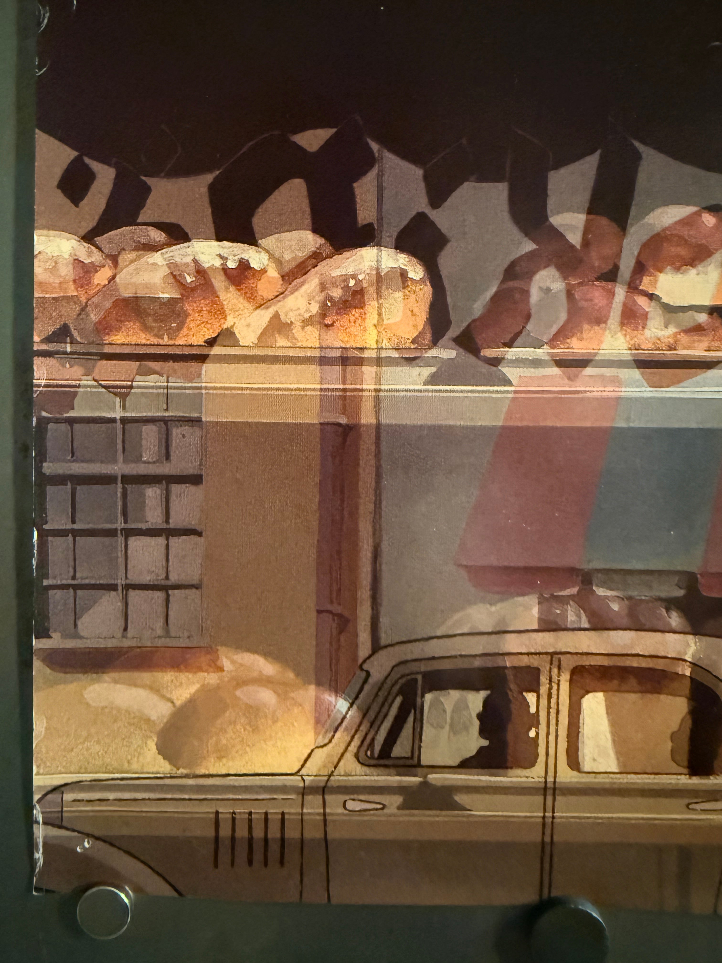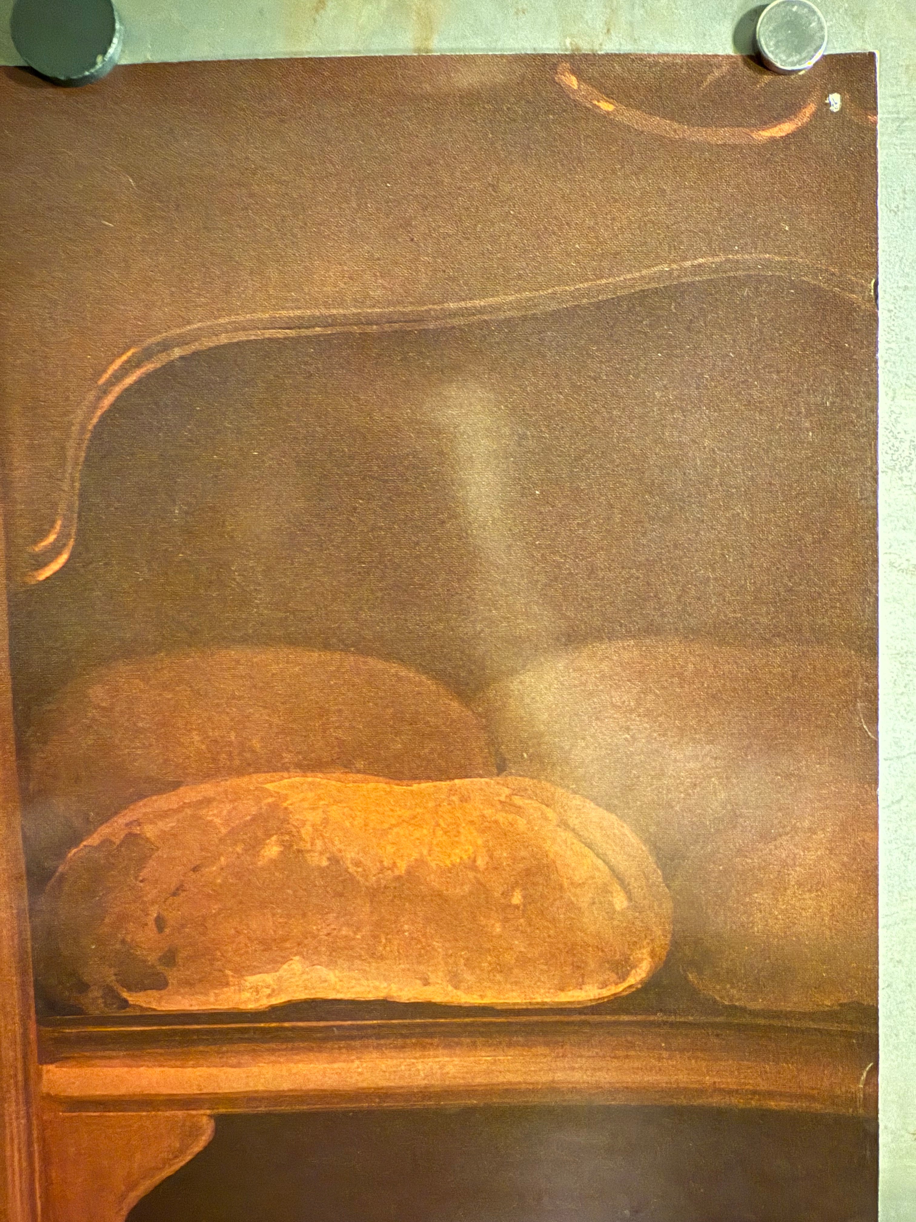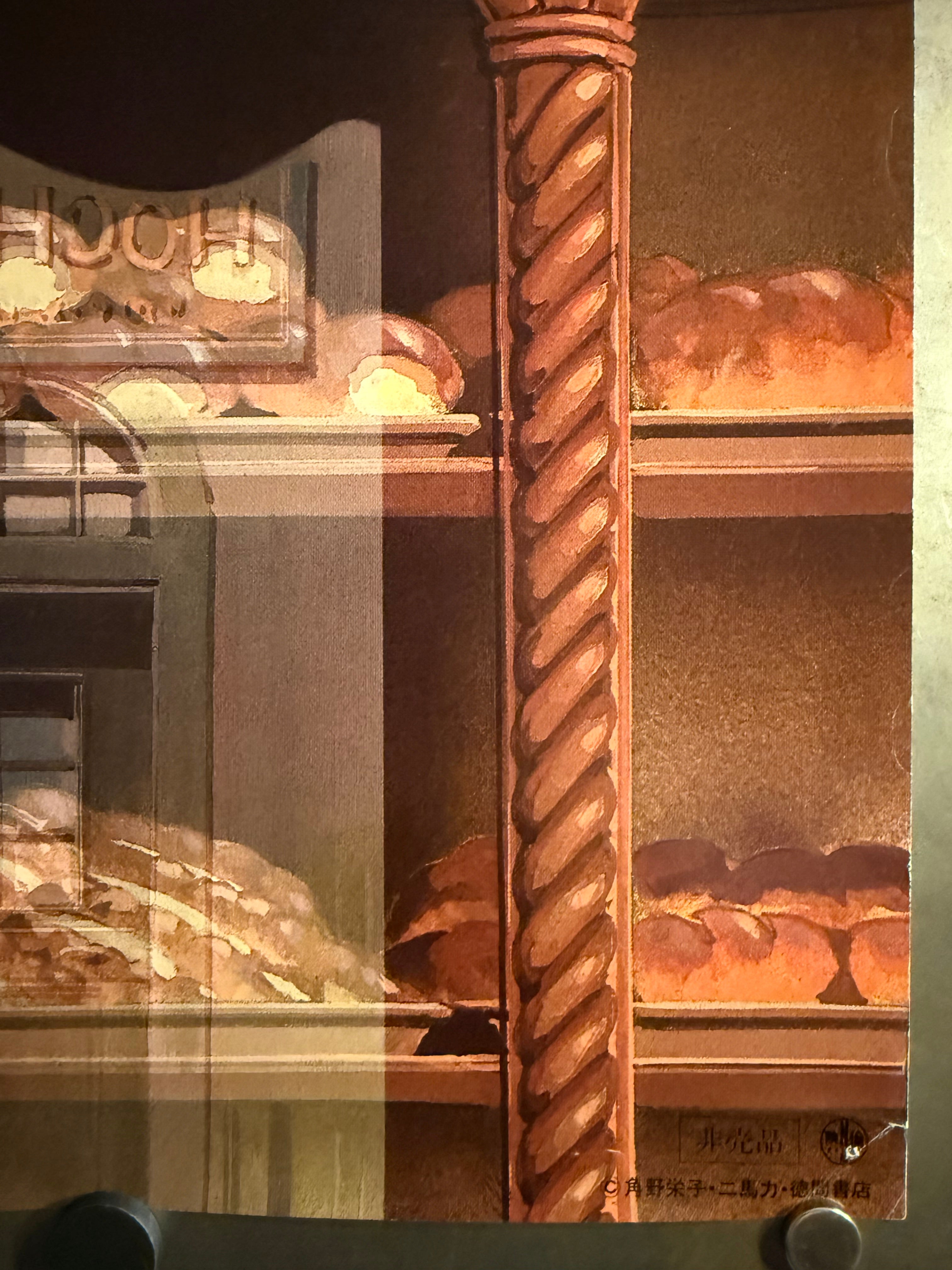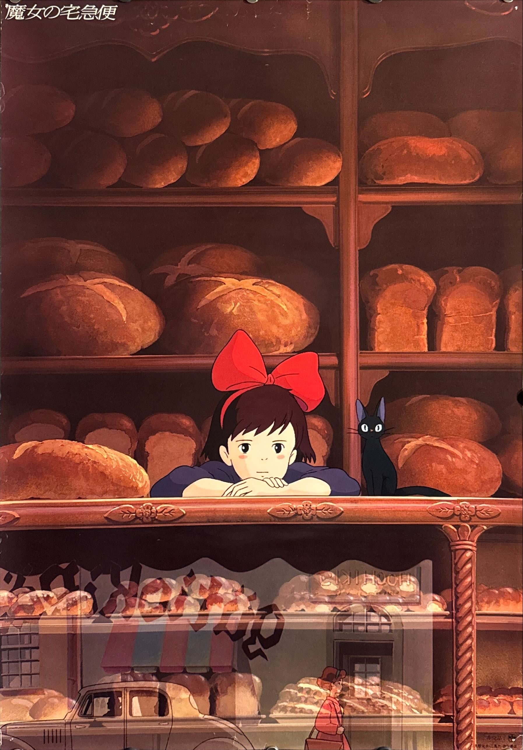 This B2 uses a serene bakery tableau: Kiki leans on the counter, chin resting on folded arms, while Jiji sits upright beside her. Behind them, shelves are packed with rustic loaves rendered in rich browns and ambers, giving the scene a cozy, lived‑in atmosphere. The Japanese title 魔女の宅急便 appears discreetly in white at the upper left, letting the artwork dominate the composition. Reflected through the shop window at the bottom, we glimpse the street outside, a parked car, and Kiki heading out with a delivery—subtly suggesting the bustle of her new life beyond this quiet moment of reflection.