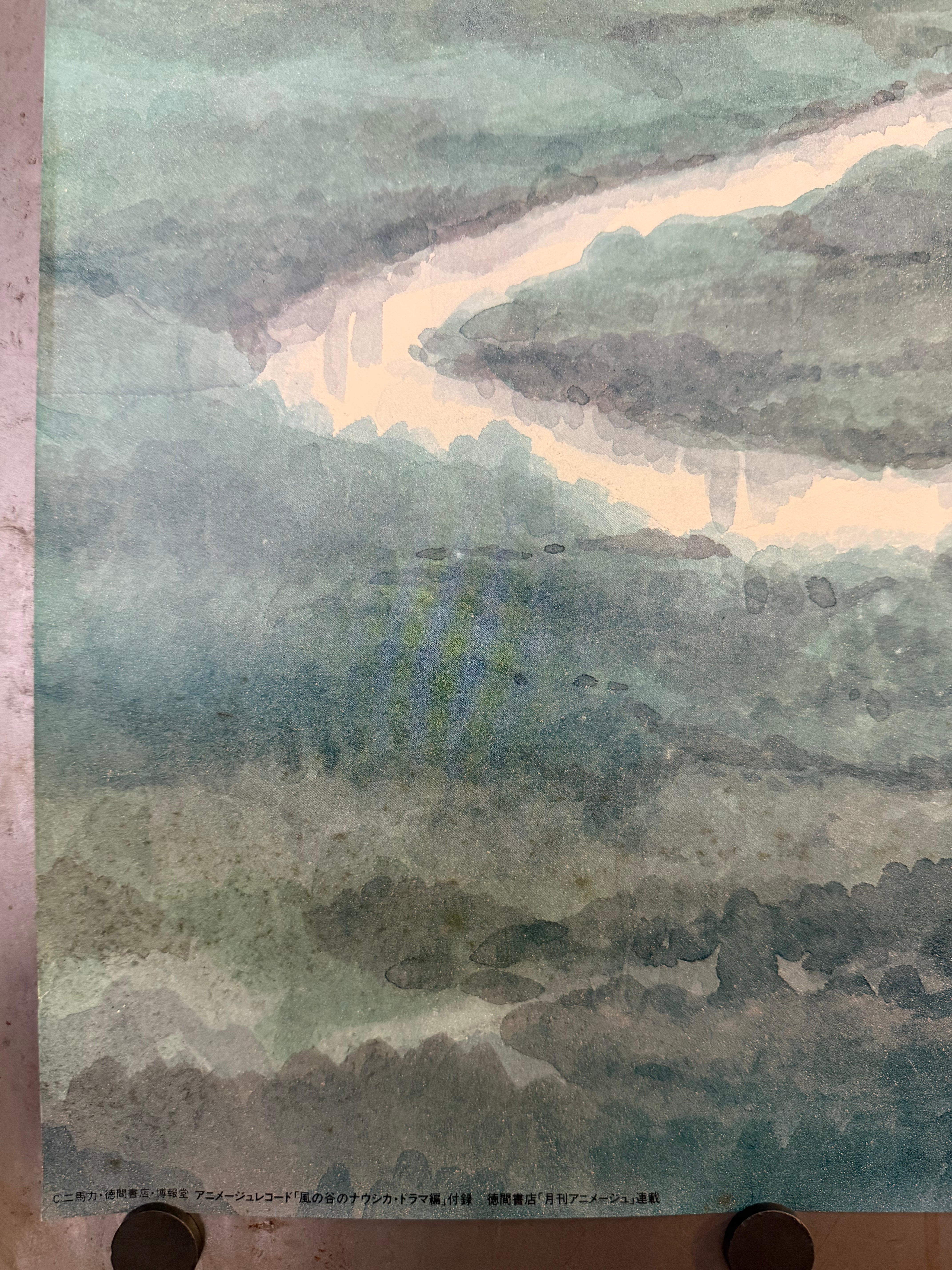 This is an original Japanese B2 promotional poster issued in 1984 for Animage Records’ “Nausicaä of the Valley of the Wind – Drama Album” (アニメージュレコード「風の谷のナウシカ・ドラマ編」). Made for record-shop display (not sold to the public), it carries the Animage / Tokuma Shoten logo at the top left and the credit 作画/宮崎駿 (“Art by Hayao Miyazaki”) at lower right.