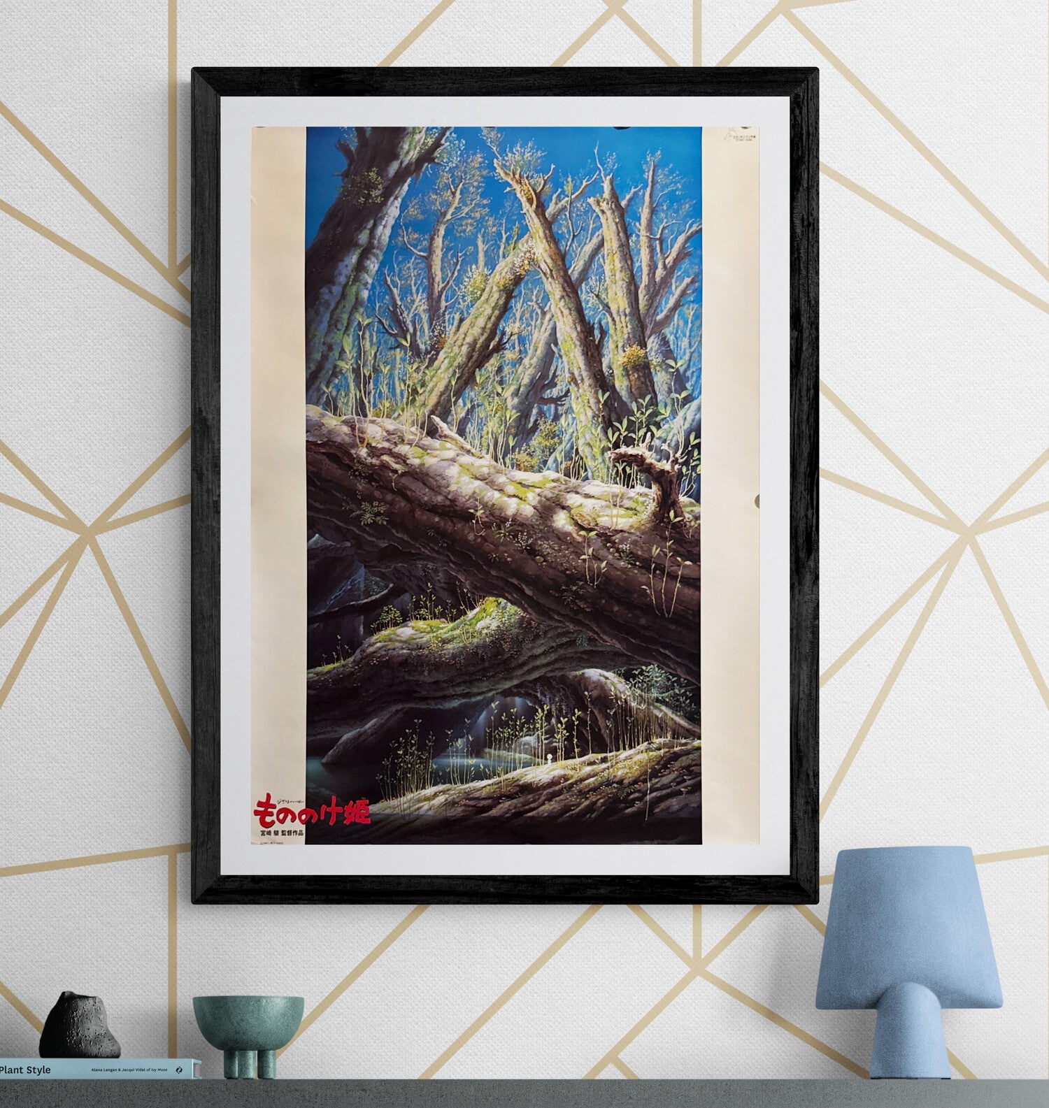 A serene yet awe‑striking sheet from Hayao Miyazaki’s Princess Mononoke—a landmark of hand‑painted background art and ecological mythmaking. This B2 first‑release poster features the enchanted forest without characters, letting Kazuo Oga–style background painting carry the mood: ancient trunks, cool shafts of light, new shoots reclaiming fallen giants. It’s one of the most contemplative images issued for the film and a perfect encapsulation of its theme—nature’s quiet, stubborn resilience.