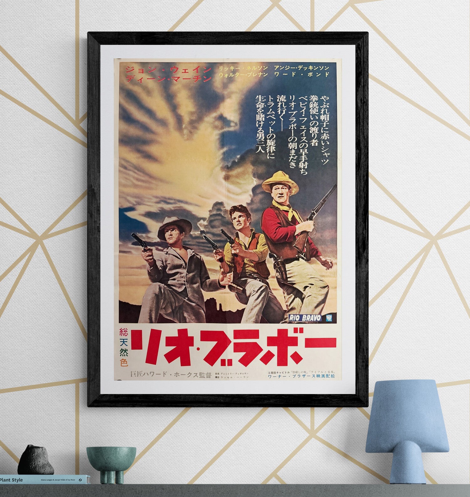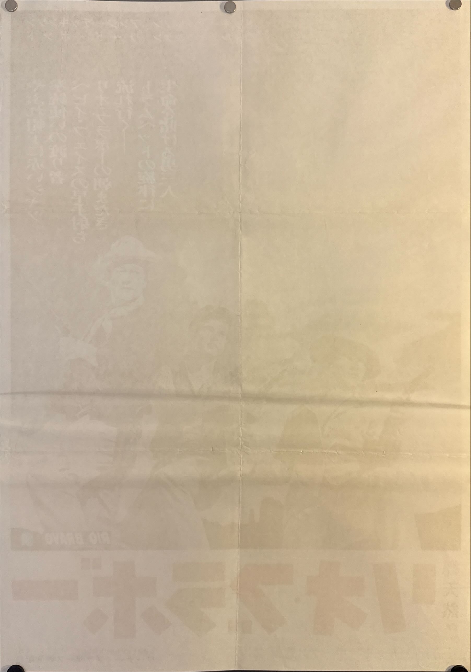 This is an original Japanese B2 poster printed in 1959 for Howard Hawks’s classic western Rio Bravo, starring John Wayne, Dean Martin, Ricky Nelson, Angie Dickinson, and Walter Brennan—with a rousing score by Dimitri Tiomkin. Released in Japan by Warner Bros., the film follows Sheriff John T. Chance and his mismatched posse holding the line against a rancher’s hired guns.