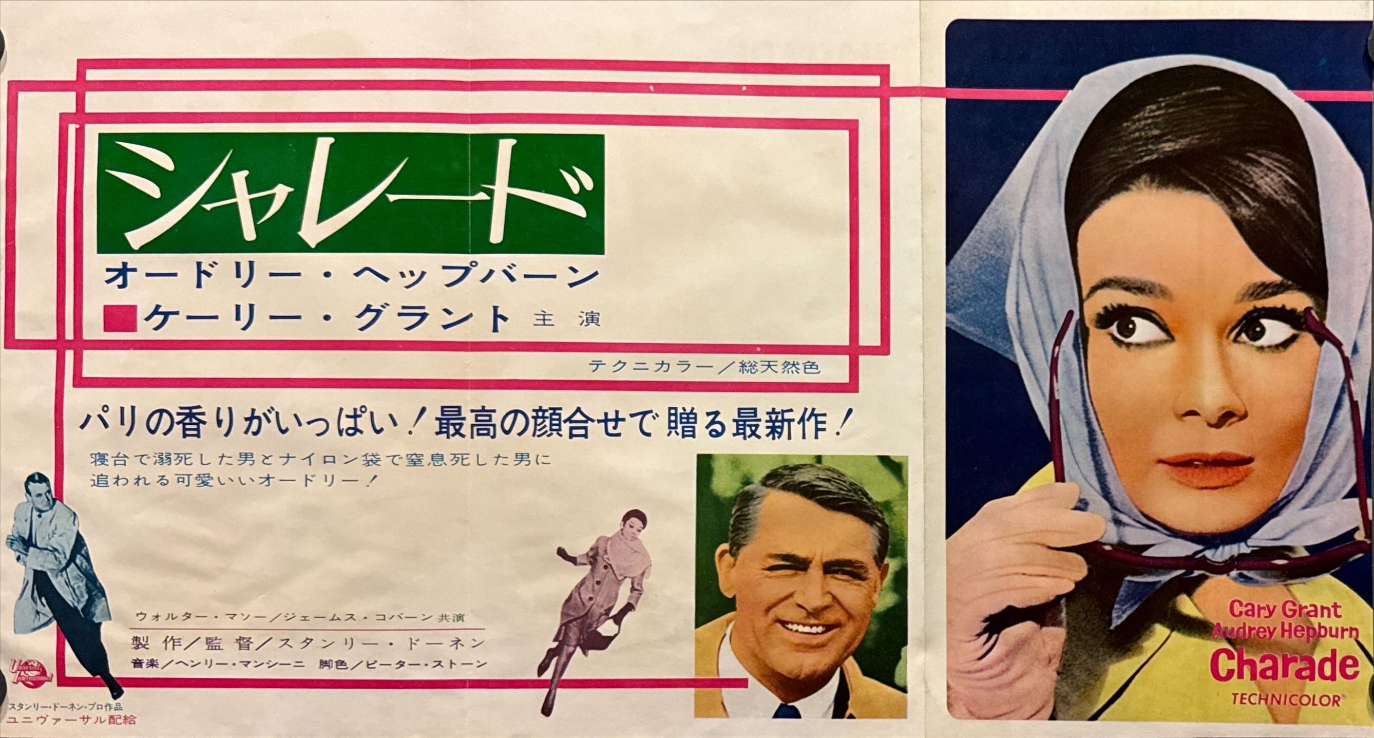 On the main panel, Hepburn appears in one of the film’s signature looks, turning with her headscarf and sunglasses in hand, set against a crisp colour block. The Japanese title “シャレード” sits in a sharp green title panel framed by pink border lines, while a bright portrait of Cary Grant and small running figure graphics emphasise the film’s playful “cat-and-mouse” chase. The reverse features an additional Charade image with a minimalist calendar-style layout—an eye-catching, period Japanese promotional touch rarely seen intact today.