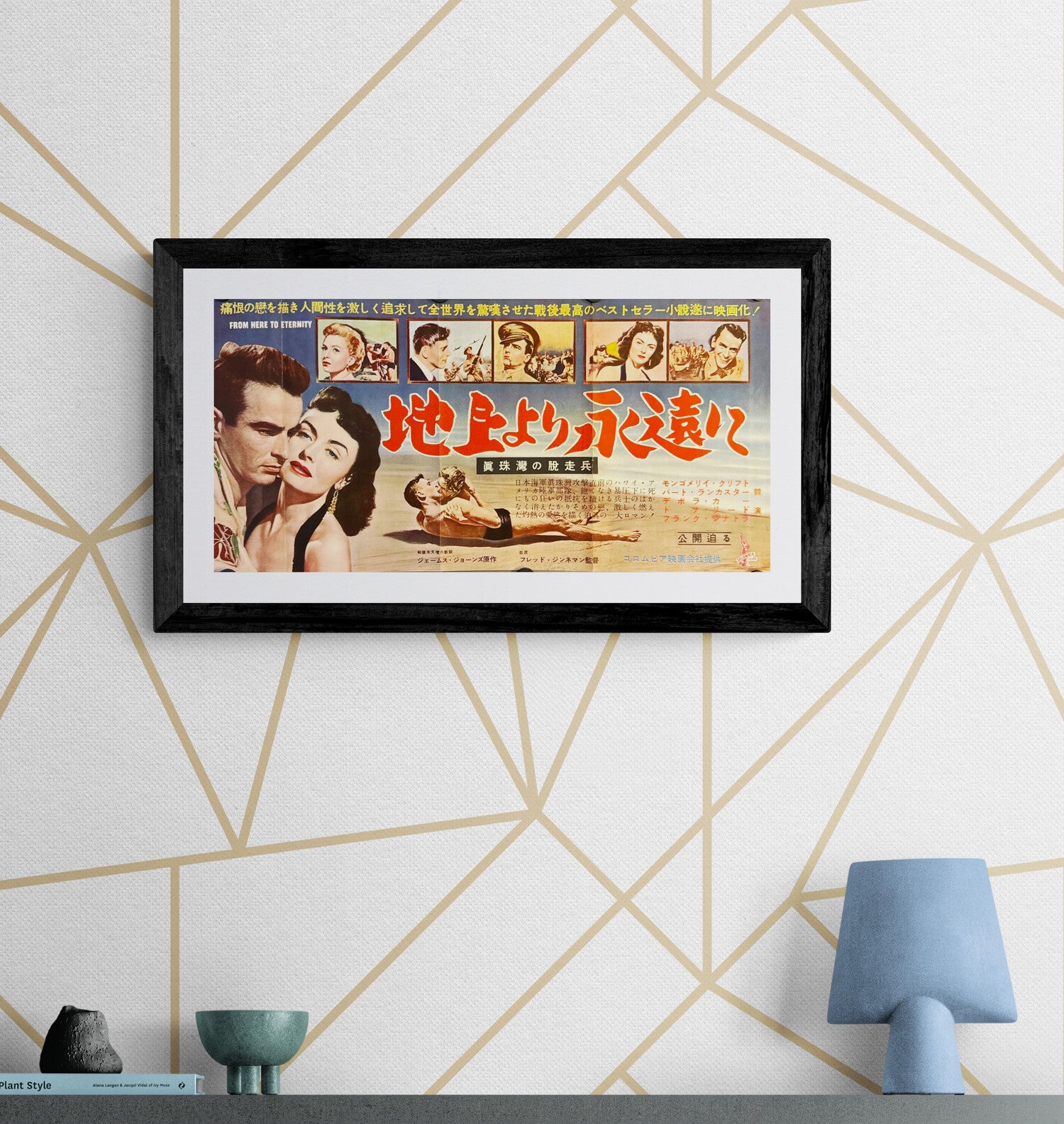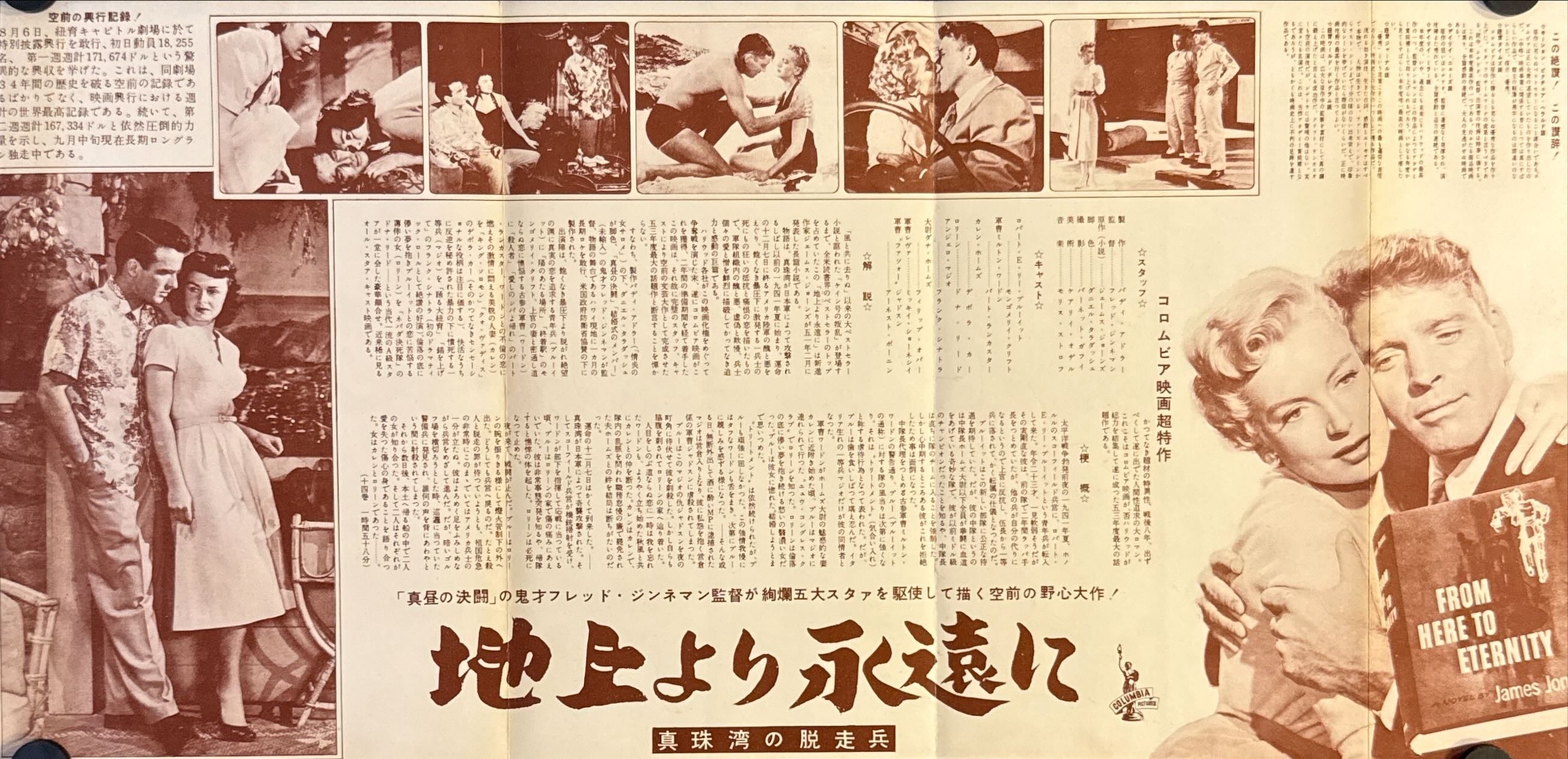 This is an original Japanese press sheet / promotional poster printed in 1953 for the first Japanese release of From Here to Eternity (地上より永遠に), the landmark Columbia Pictures drama directed by Fred Zinnemann and starring Burt Lancaster, Montgomery Clift, Deborah Kerr, Donna Reed, Frank Sinatra, and Ernest Borgnine. This is a scarce, theatre-era piece of paper ephemera—folded as issued and intended for cinema promotion (distinct from a standard B2 poster).