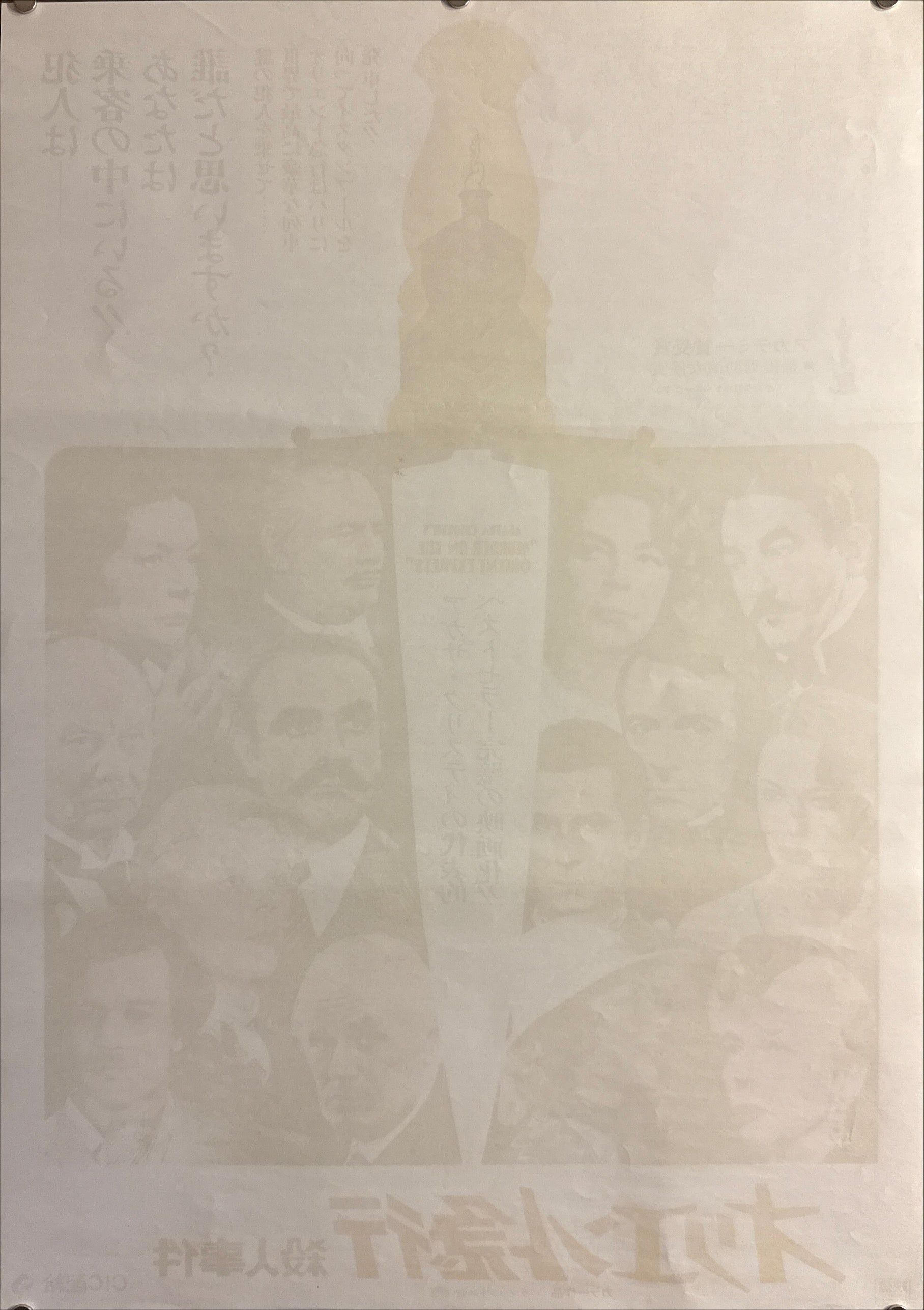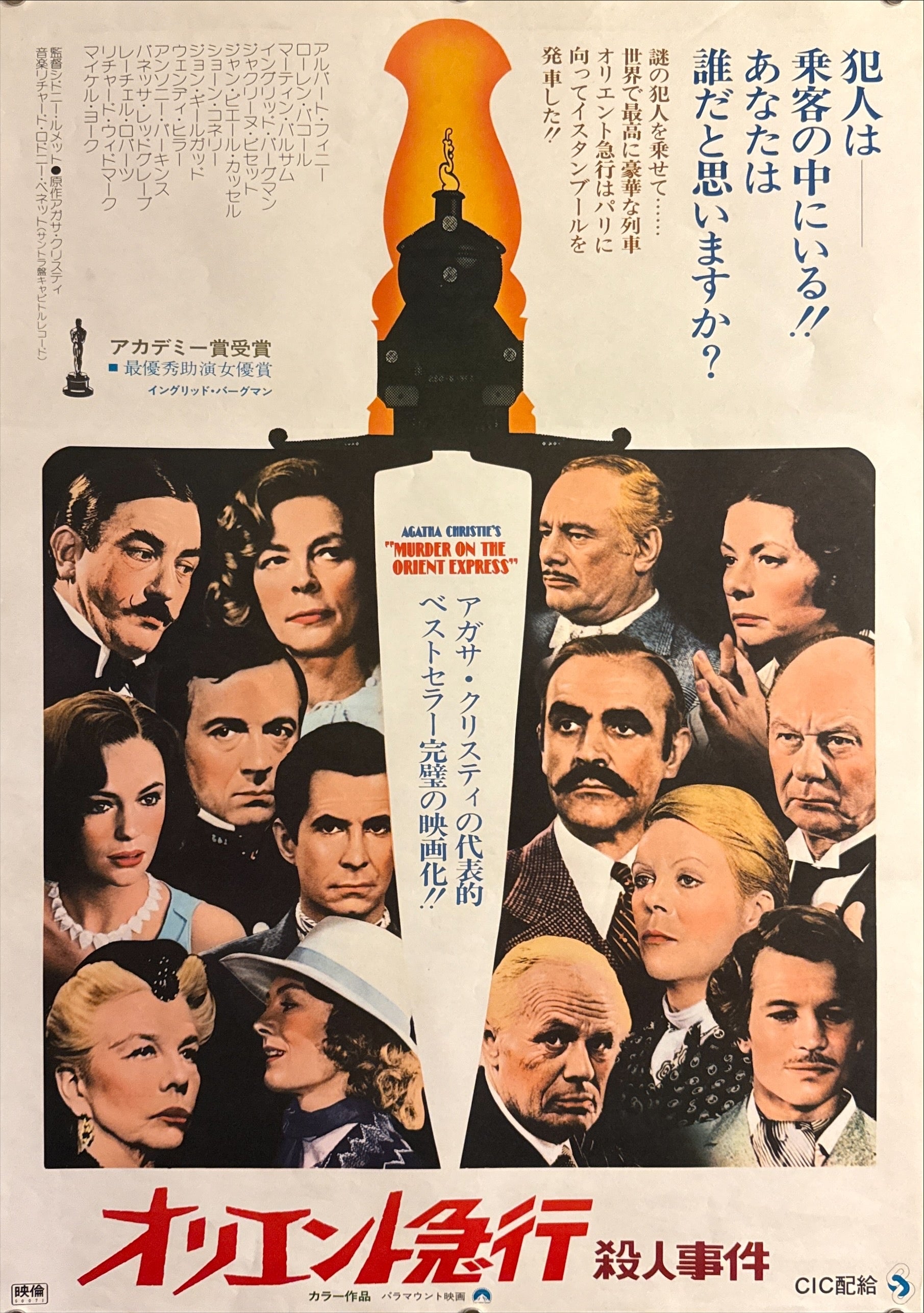 This is an original Japanese B2 movie poster printed in 1974 for the first Japanese theatrical release of Murder on the Orient Express (オリエント急行殺人事件), a United Kingdom / United States mystery directed by Sidney Lumet, based on Agatha Christie, starring Albert Finney as Hercule Poirot, with an all-star ensemble including Lauren Bacall, Ingrid Bergman, Sean Connery, Jacqueline Bisset, Anthony Perkins, John Gielgud, and Vanessa Redgrave.