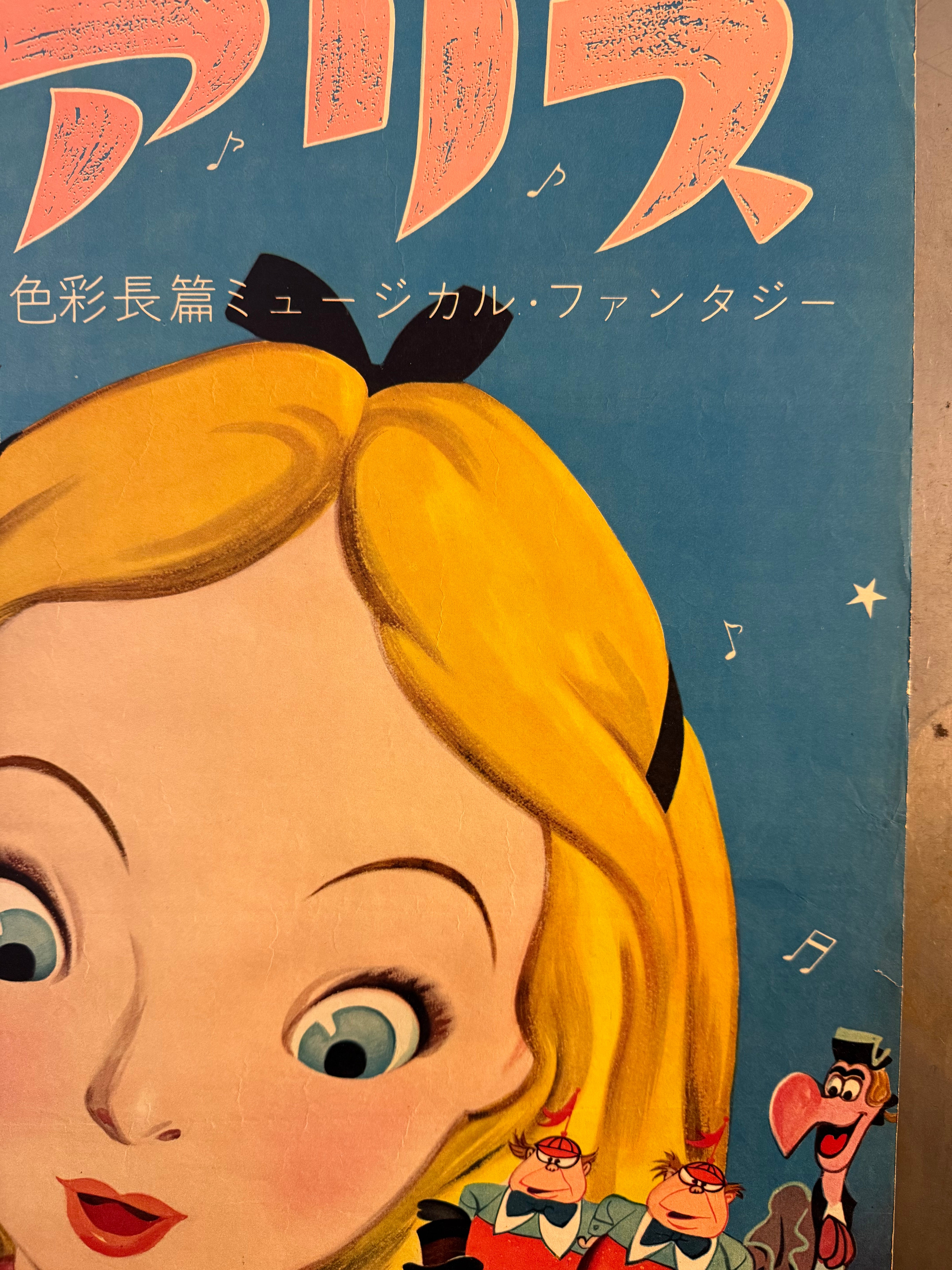A striking 1953 first-release Japanese B2 for Disney’s Alice in Wonderland—and one of only two known styles produced for the film’s Japanese first release. This is the coveted Japan-only illustrated design featuring a luminous, oversized portrait of Alice floating over a parade of Wonderland characters, all set against a deep, mid-century blue field sprinkled with whimsical musical notes—perfectly echoing the Japanese “colour feature-length musical fantasy” positioning printed on the sheet.