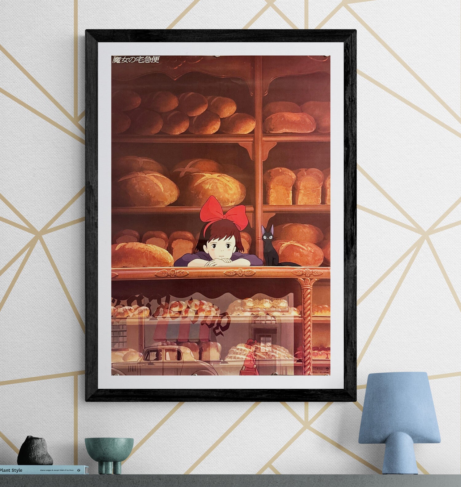 The quintessential bakery-window key art: Kiki and Jiji rest their chins on the counter as rows of rustic loaves glow behind them, while a subtle shop-front reflection anchors the lower register. Warm browns and honeyed light capture the film’s gentle, everyday magic—one of the most recognizable Ghibli poster images.