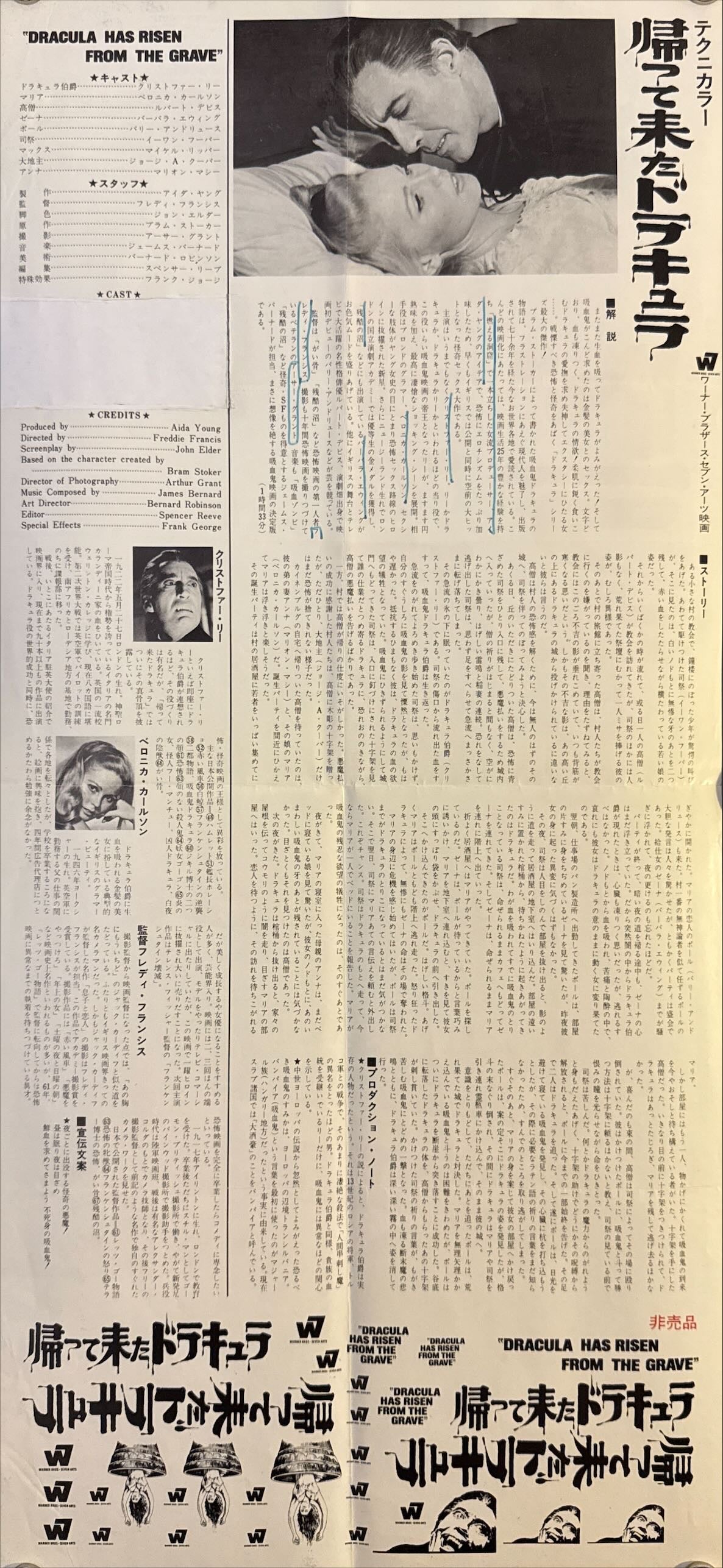 This is an original Japanese Speed Poster / Press-Sheet printed in 1969 for the first theatrical release of Dracula Has Risen from the Grave (1968), Hammer’s Gothic horror directed by Freddie Francis and released domestically by Warner Bros.–Seven Arts. Starring Christopher Lee as Count Dracula with Rupert Davies, Veronica Carlson, Barry Andrews, Barbara Ewing, and Ewan Hooper, this is the compact lobby/press format issued to theaters and the trade.