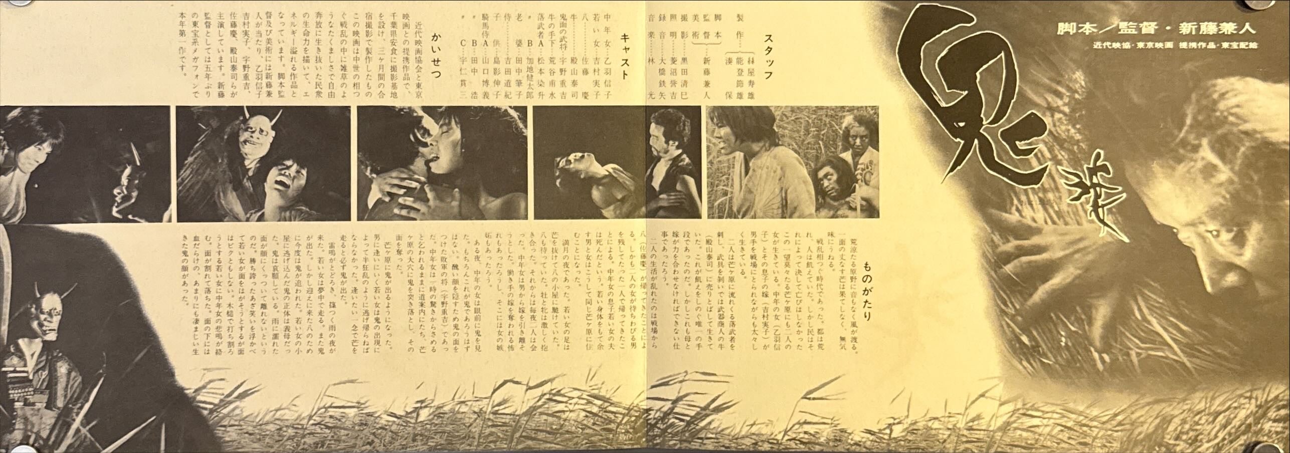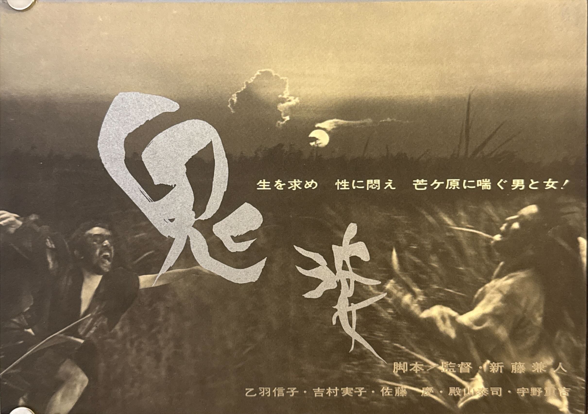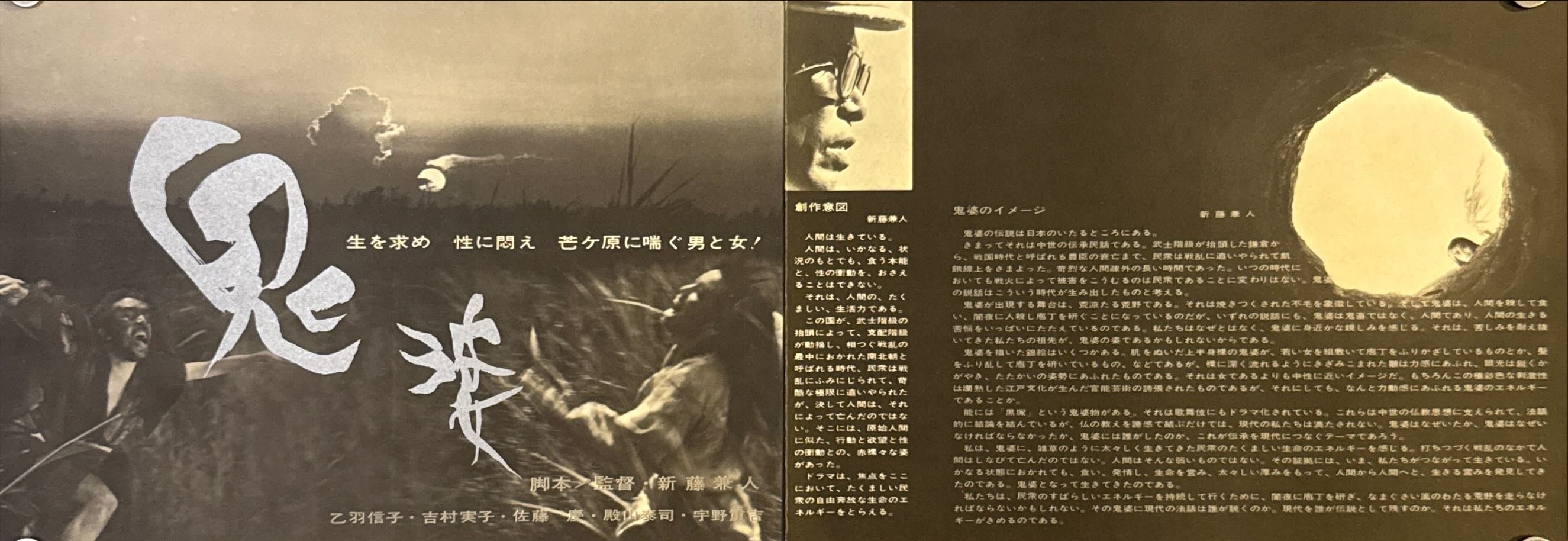 Sepia-toned, photo-montage austerity: moonlit reeds rage across the horizontal field as fleeing figures slash through the grass; the huge brushed kanji title 「鬼婆」 sits like a scar across the center. The right panel carries production notes in vertical columns beside a portrait of Shindō and a stark circular “mask-hole” vignette—minimal, literary and chilling.