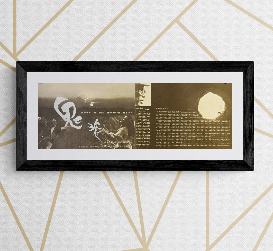 This is an original Japanese fold-out mini-poster / program pamphlet printed in 1964 for the first theatrical release of Onibaba, Kaneto Shindō’s haunting jidai-gekij horror starring Nobuko Otowa and Jitsuko Yoshimura. Distributed to cinemas in a slim, foldable format, it functions as both an advance handout and a compact lobby display.