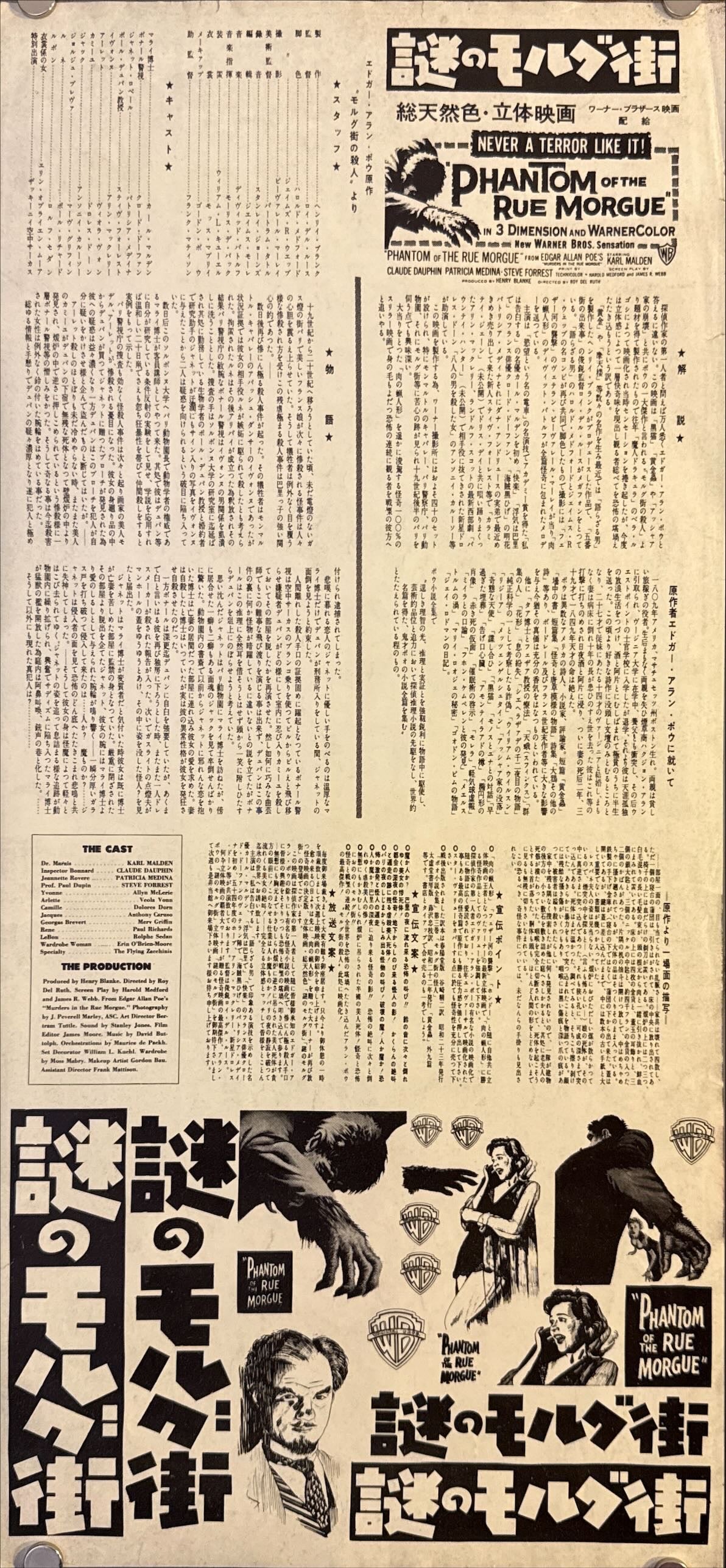 This is an original Japanese speed poster (press-sheet style, c.24 × 51 cm) printed in 1954 for Warner Bros.’ Phantom of the Rue Morgue, directed by Roy Del Ruth and starring Karl Malden, Claude Dauphin, and Patricia Medina—an adaptation of Edgar Allan Poe’s 1841 tale The Murders in the Rue Morgue. Issued domestically for theaters and distributors, speed posters were printed in small quantities and heavily used; survival is uncommon, especially with the original double-sided press text intact.