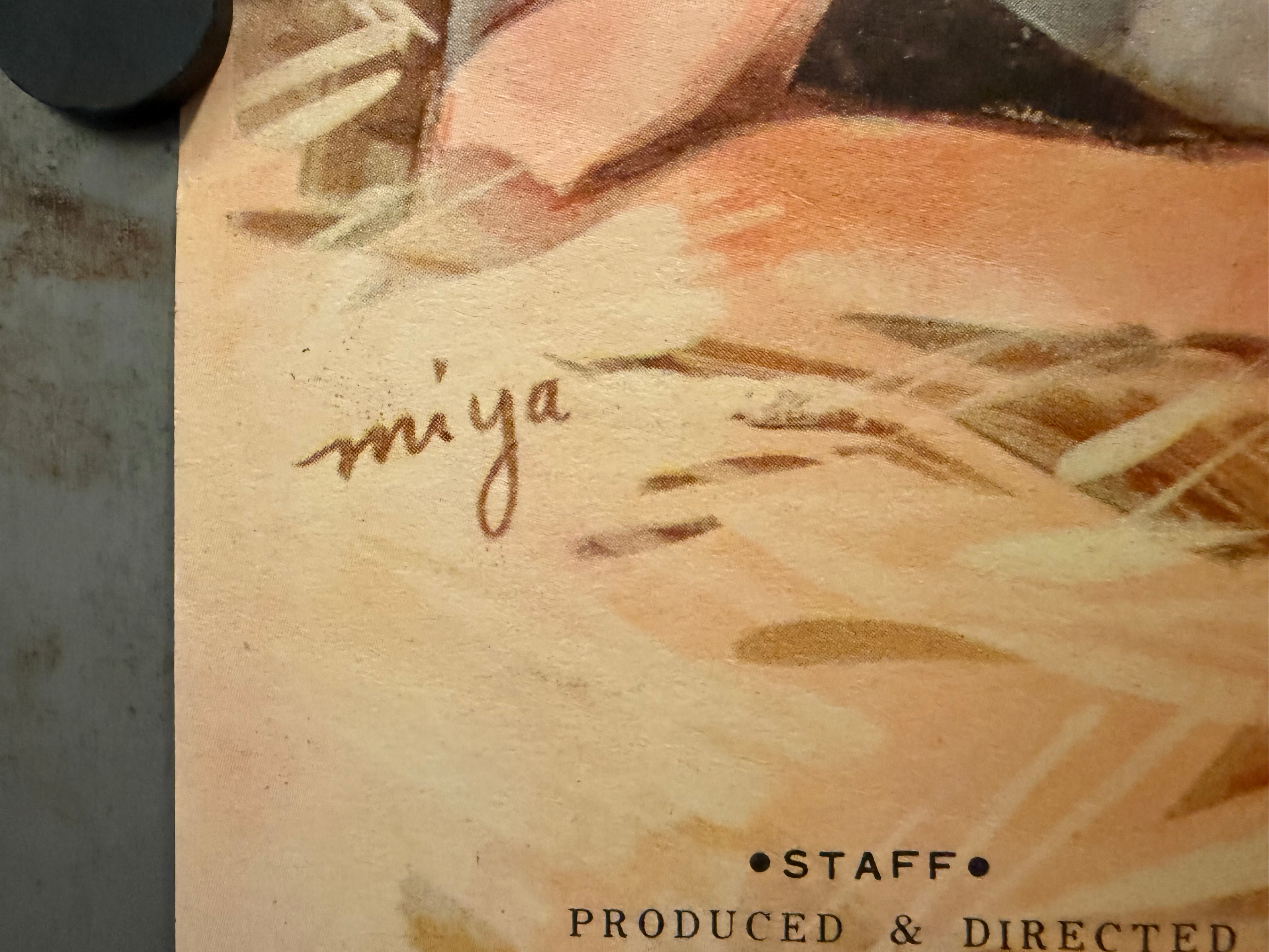 A sensational hand‑painted pin‑up tableau: Jane Russell reclines in straw—blouse provocatively askew, revolver across a scarlet skirt—while the English title THE OUTLAW floats beside bold, canary‑yellow brush lettering 「ならず者」 on a matte charcoal ground. At upper right sits RKO Radio Pictures’ lightning‑bolt shield; the Japanese titling at upper left reads 「ハワード・ヒューズ 製作・監督 / ジェーン・ラッセル 主演」. The illustration is signed “miya” at lower left. Contemporary auctioneers and dealers credit comparable early‑1950s Japanese poster art to the illustrator “Miya” (sometimes cataloged as “Miya Uchi / Miyauchi”), including the famed Japanese Thing from Another World STB and The Las Vegas Story B2; while biographical details remain elusive, the signature match is consistent across these RKO‑era campaigns.