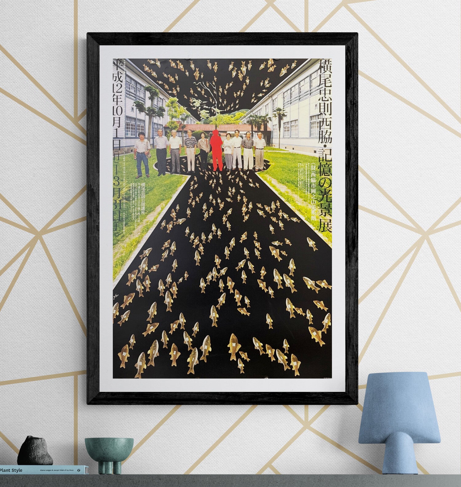 Yokoo’s poster stages a haunting, surreal procession. Across the top, a row of former school staff or townspeople stands in front of a classic wooden school building, rendered in crisp photographic colour. At the centre, one solitary figure is picked out in flat red, becoming a ghostly stand‑in for memory—or for Yokoo himself, who was born in Nishiwaki in 1936.