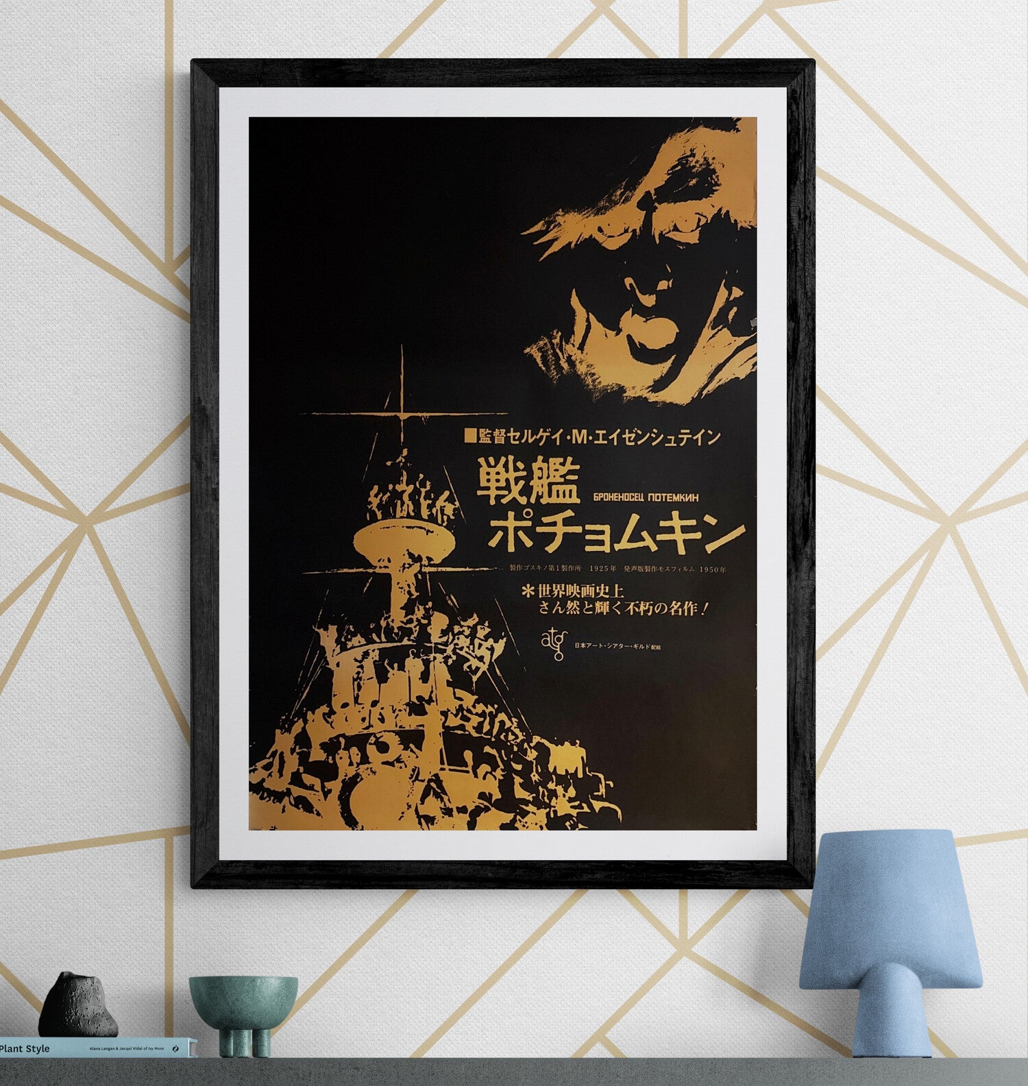 A striking, minimalist black-and-gold composition—graphic, confrontational, and unmistakably “art cinema” in tone. The upper-right face (screaming in anguish) and the lower-left silhouette of the battleship and crowd create a brutal diagonal tension, perfectly echoing the film’s revolutionary impact. The typography is equally strong: the director credit 監督 セルゲイ・M・エイゼンシュテイン and the bold title 戦艦ポチョムキン sit in the centre like a manifesto, with the ATG mark below—an iconic Japanese art-house presentation.