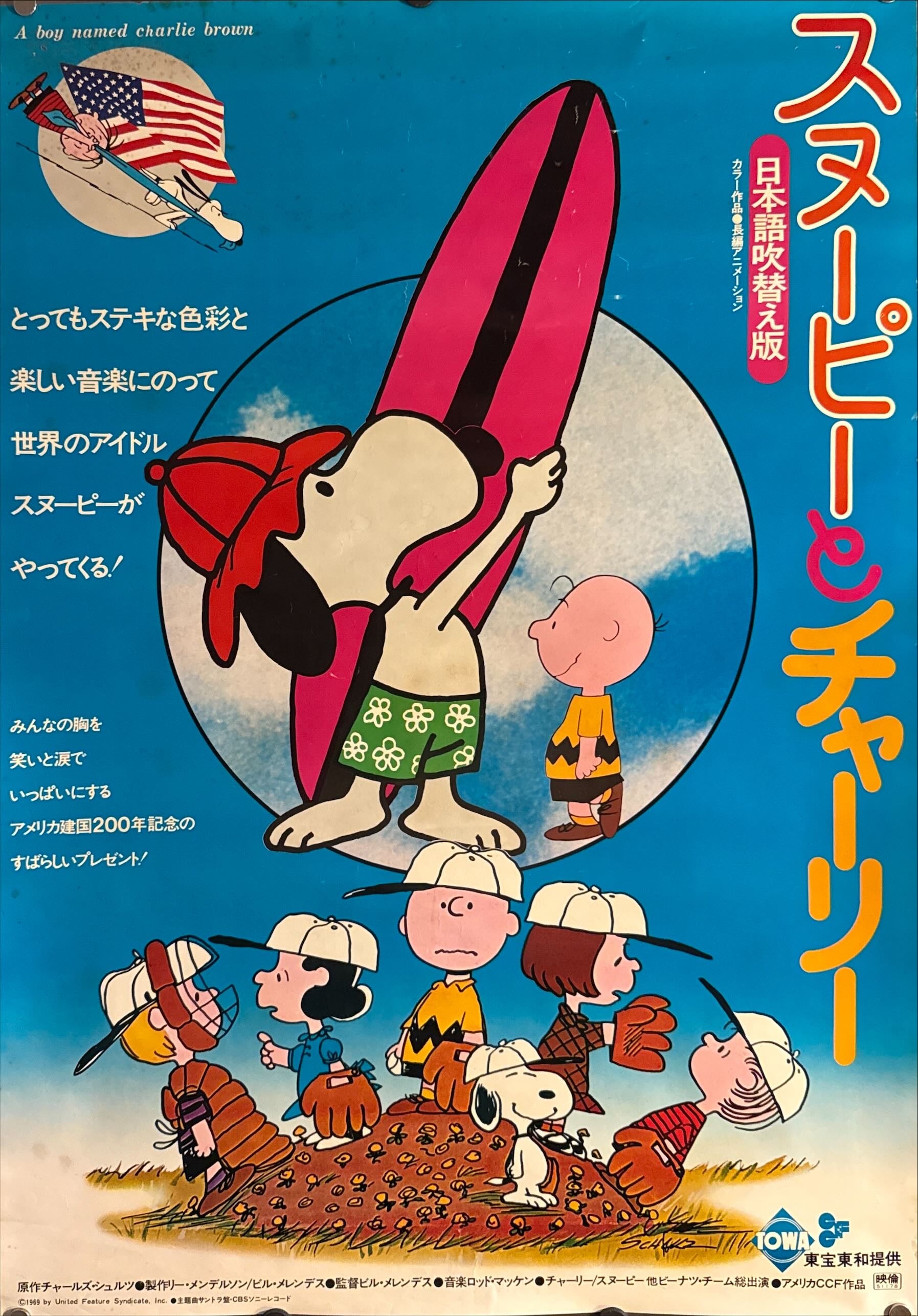 This is an original Japanese B2 poster printed in 1976 for the domestic theatrical release of A Boy Named Charlie Brown (スヌーピーとチャーリー), the first Peanuts feature film directed by Bill Melendez and distributed in Japan by Toho-Towa (TOWA). First-issue Japanese posters for Peanuts titles are highly collectible.