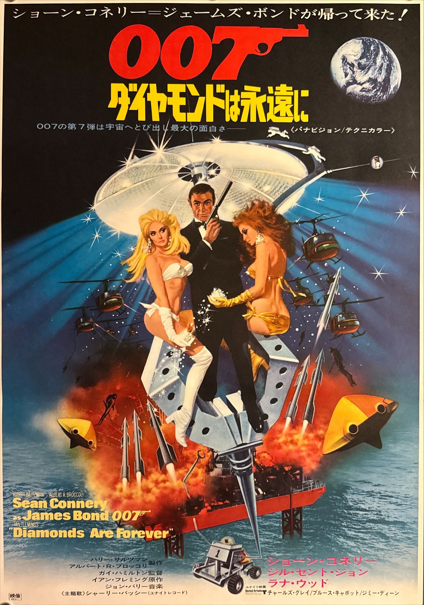 This is an original Japanese B2 movie poster printed in 1971 for the first Japanese theatrical release of Diamonds Are Forever (007/ダイヤモンドは永遠に), a United Kingdom / United States James Bond film directed by Guy Hamilton, starring Sean Connery as 007, with Jill St. John and Lana Wood (and Charles Gray).