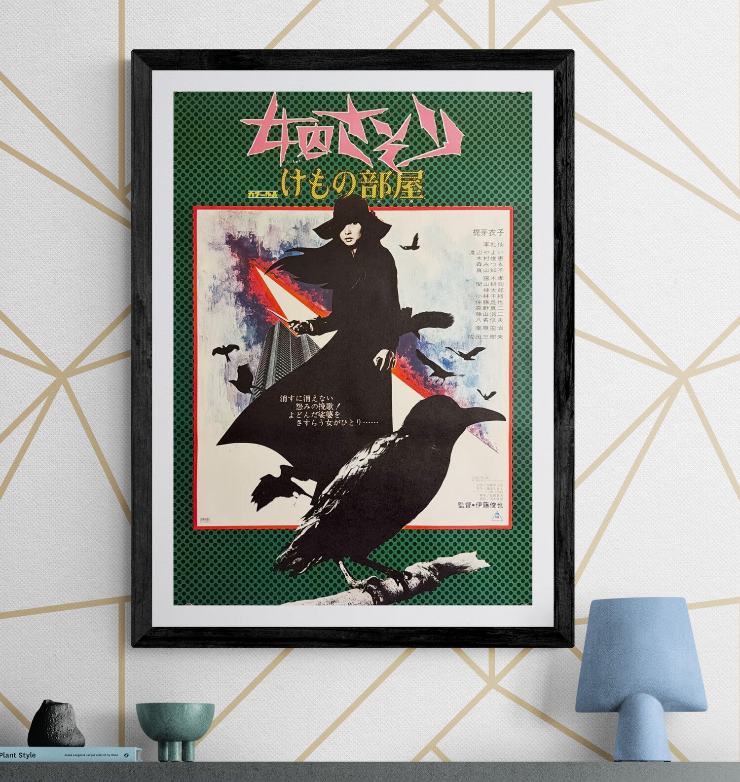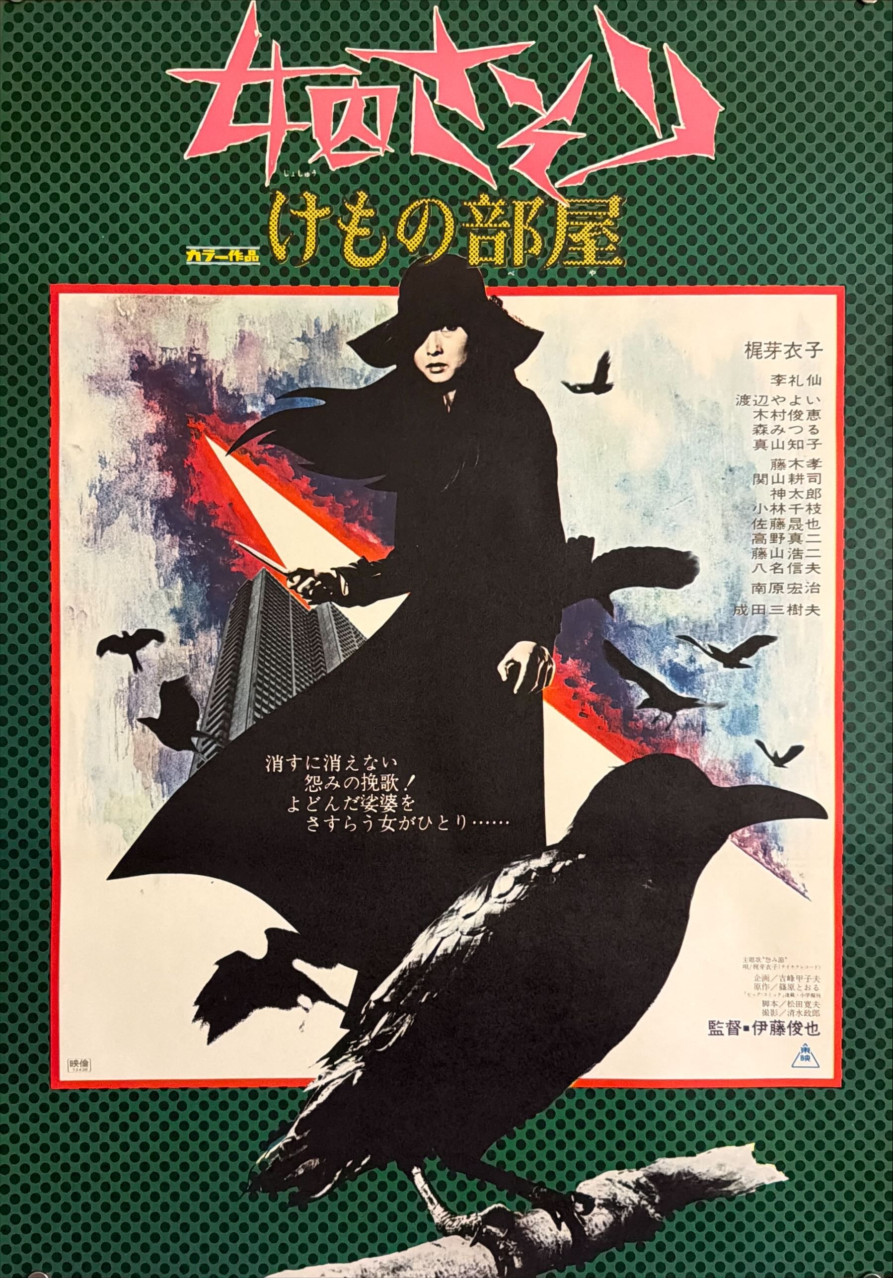 A superb, graphic, pop-art-inflected Japanese design that feels closer to underground illustration than conventional studio advertising. Against a green halftone field, Kaji’s Scorpion appears as a black, windswept silhouette—wide-brim hat, cloak-like coat—set within a framed “scene” of painterly urban texture and slashing red-white diagonal energy. A huge crow dominates the lower foreground while smaller birds scatter across the sky, reinforcing the film’s ominous, predatory mood. The jagged pink title 「女囚さそり」 at top, paired with the subtitle 「けもの部屋」, gives the poster a razor-sharp 1970s edge—one of the most visually striking campaign designs in the entire series.