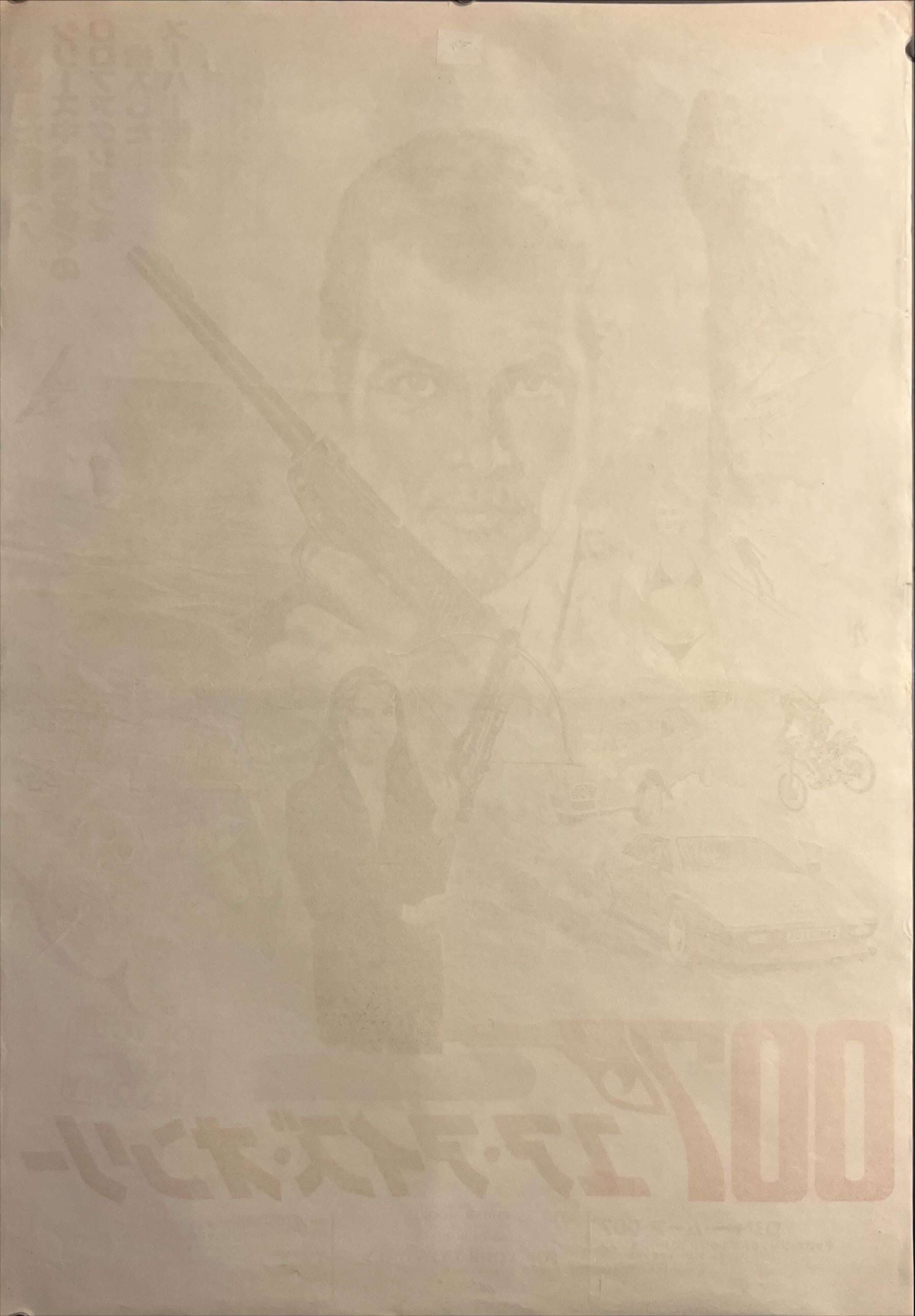 This is the famous Japan-only illustrated campaign art by the celebrated poster artist Hisamatsu Noguchi (野口久松). It’s a painterly, detail-packed montage that reads like a “greatest hits” of early-’80s Bond spectacle: Moore dominates the centre with pistol raised, while the surrounding imagery erupts into ski/mountain peril, helicopters, sea explosions, divers, car chases, and gadgetry—rendered with the crisp narrative clarity and pop action energy collectors associate with Noguchi’s work. The oversized red “007” pistol logo crowns the design, and the huge Japanese title 「007/ユア・アイズ・オンリー」 anchors the bottom in bold red typography—an exceptionally displayable Bond B2 that differs completely from the photographic one-sheets used elsewhere.