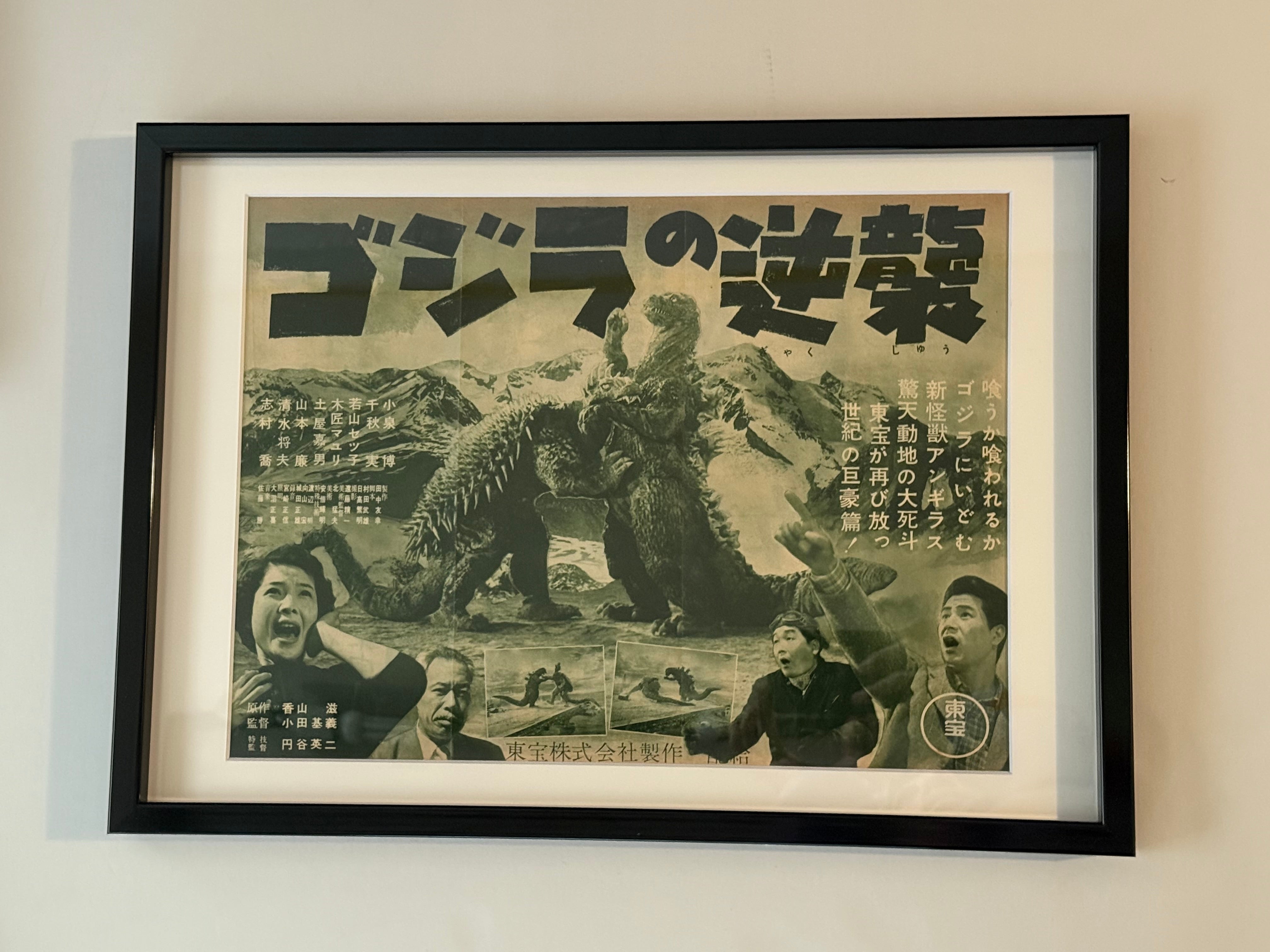 This has been professionally mounted and framed as shown in a modern black frame with an off‑white mount and clear glazing. Sold framed as photographed—ready to hang and an instant centerpiece for any Godzilla or tokusatsu collection.