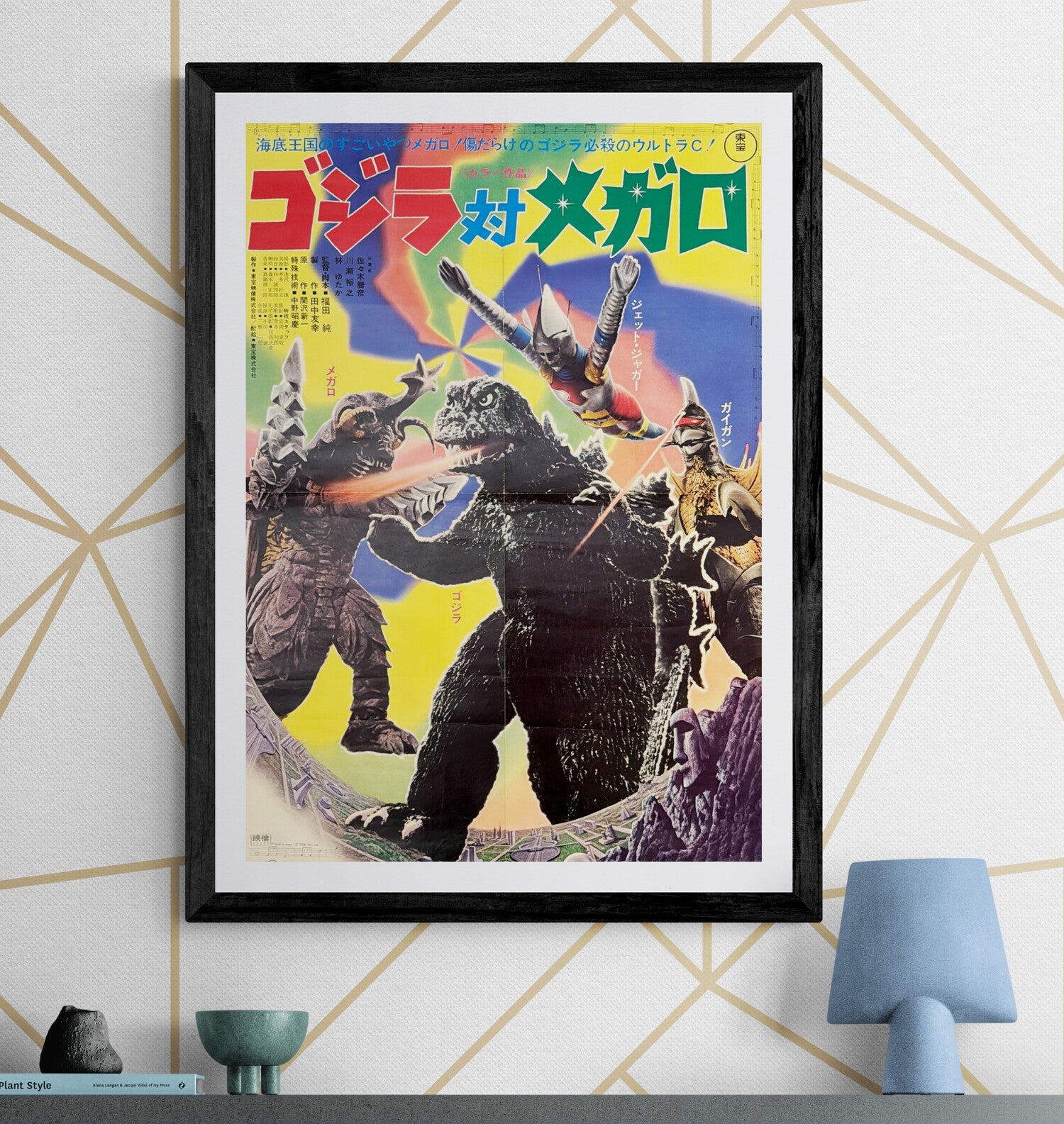 The poster artwork captures the wild, colorful energy of the film. Godzilla takes center stage, blasting his atomic breath at Megalon, while Jet Jaguar soars into the fray and Gigan attacks from the side. The psychedelic rainbow-hued background intensifies the sense of spectacle, reflecting the playful yet action-packed spirit of the film. With bold typography and character callouts in Japanese, the design embodies Toho’s 1970s poster aesthetic.