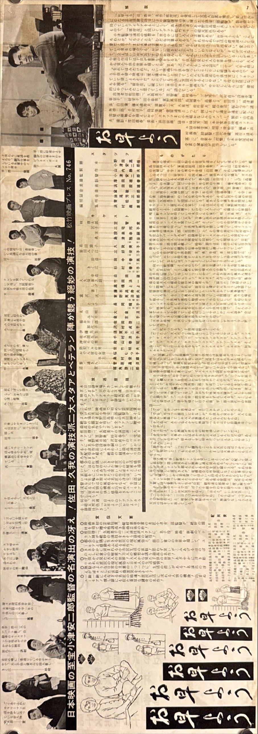 The reverse is equally appealing as an original theatrical artifact, printed in monochrome with extensive publicity text, cast and staff listings, scene stills, and whimsical line illustrations echoing the film’s domestic comedy. Like other surviving Ozu speed posters, it serves almost as a compact studio press sheet on the back, adding real documentary value.