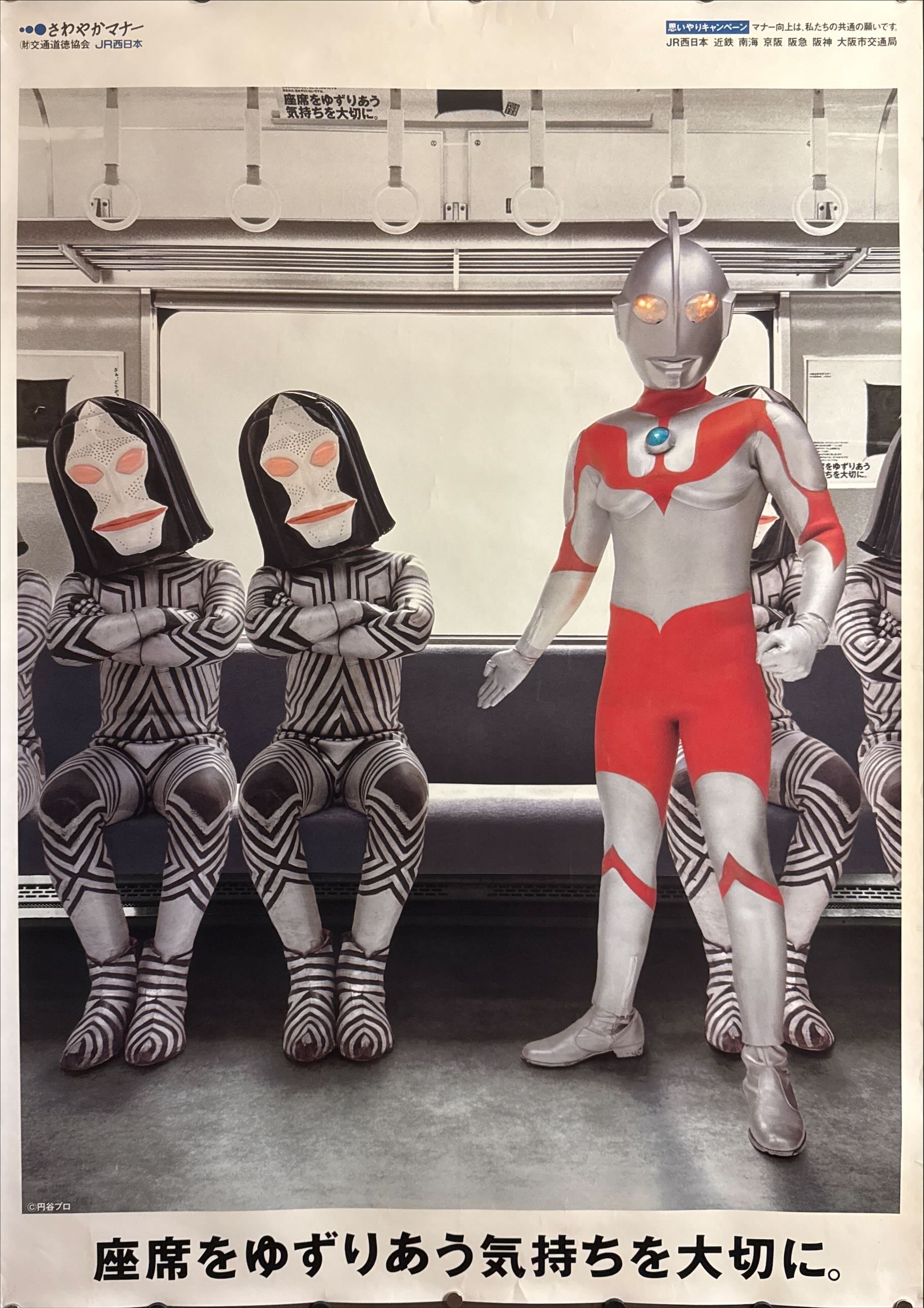 A very rare 2007 Kansai “Omoiyari Campaign” B1 railway poster featuring Ultraman vs. Dada—an iconic piece of Japanese public‑manners design history with serious presence on the wall and a message that still resonates: “Cherish the feeling of sharing seats with one another.”