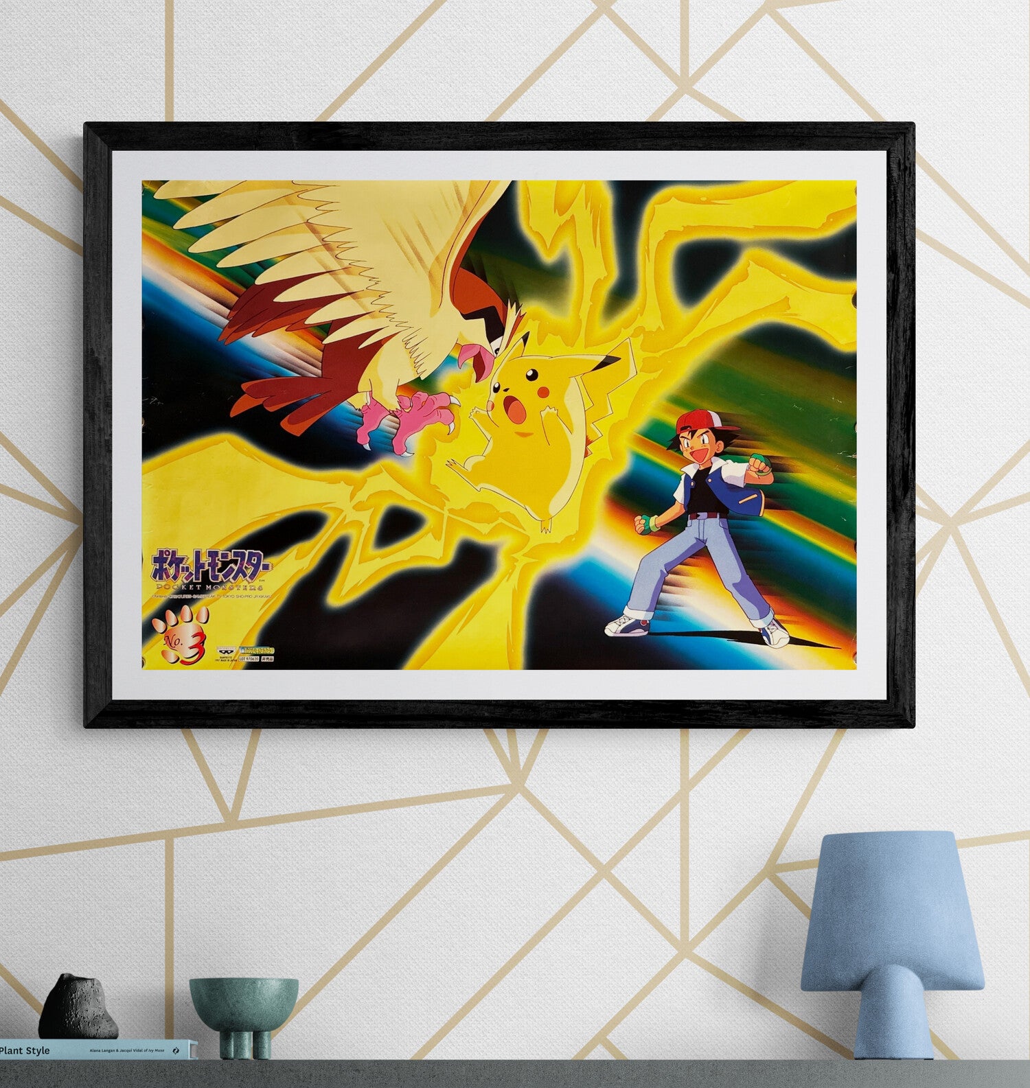 A high-impact, action-packed illustration centred on Satoshi (Ash) and Pikachu, captured mid-battle as Pikachu unleashes a dramatic lightning attack that cuts across the entire composition. The dynamic diagonal motion, saturated colour gradients, and explosive energy effects create a classic late-’90s anime look—bold, clean, and instantly recognisable on the wall. The lower corner features the ポケットモンスター / POCKET MONSTERS logo alongside the No.3 series mark, giving the poster a strong “collectible set” identity.