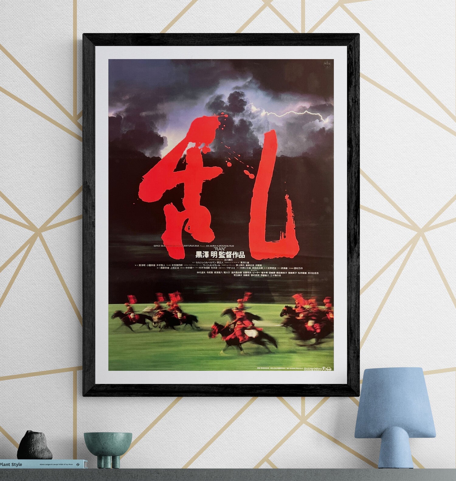 Minimal yet thunderous: a storm-black sky split by lightning, with cavalry streaking across a green plain. The giant blood-red brushed kanji 「乱」 dominates the field—an elegant statement piece for Kurosawa’s masterpiece.
